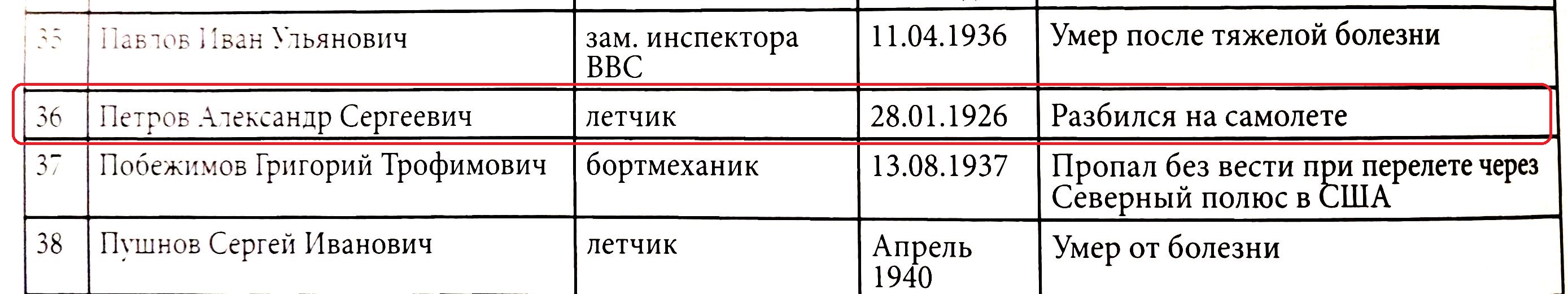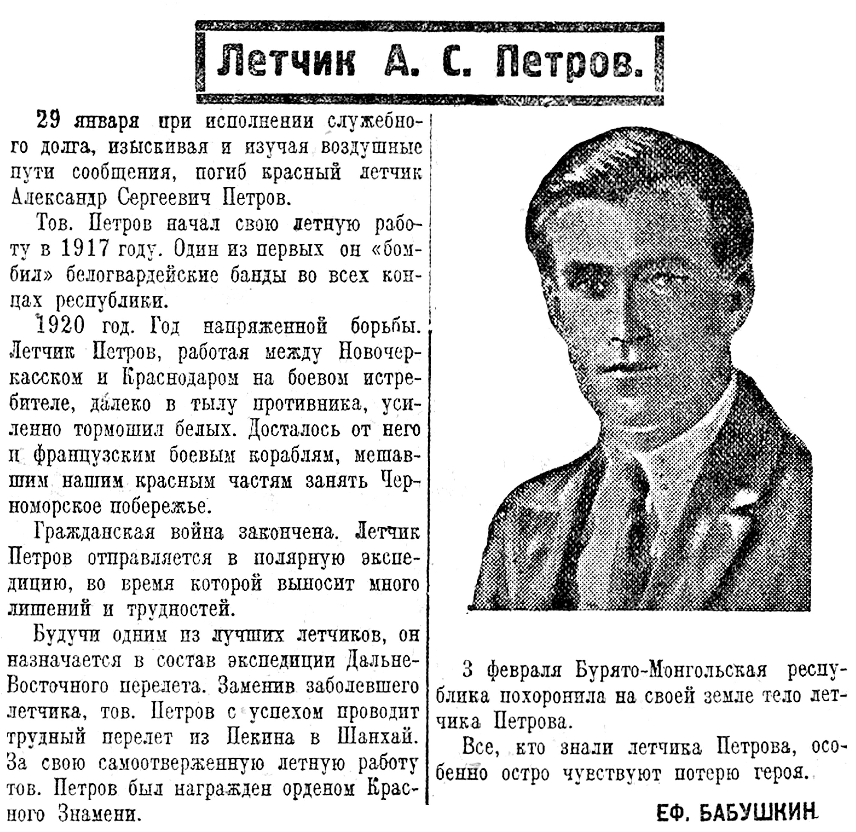 "При исполнении служебного долга по изысканию и изучению воздушных путей сообщения погиб летчик Петров Александр Сергеевич. 3 февраля при участии партийных, профессиональных и военных организаций и при массовом скоплении граждан города Троицкосавска состоялись похороны его на местном кладбище. С речами на могиле погибшего летчика выступали представители всех организаций и присутствующие его сотоварищи".