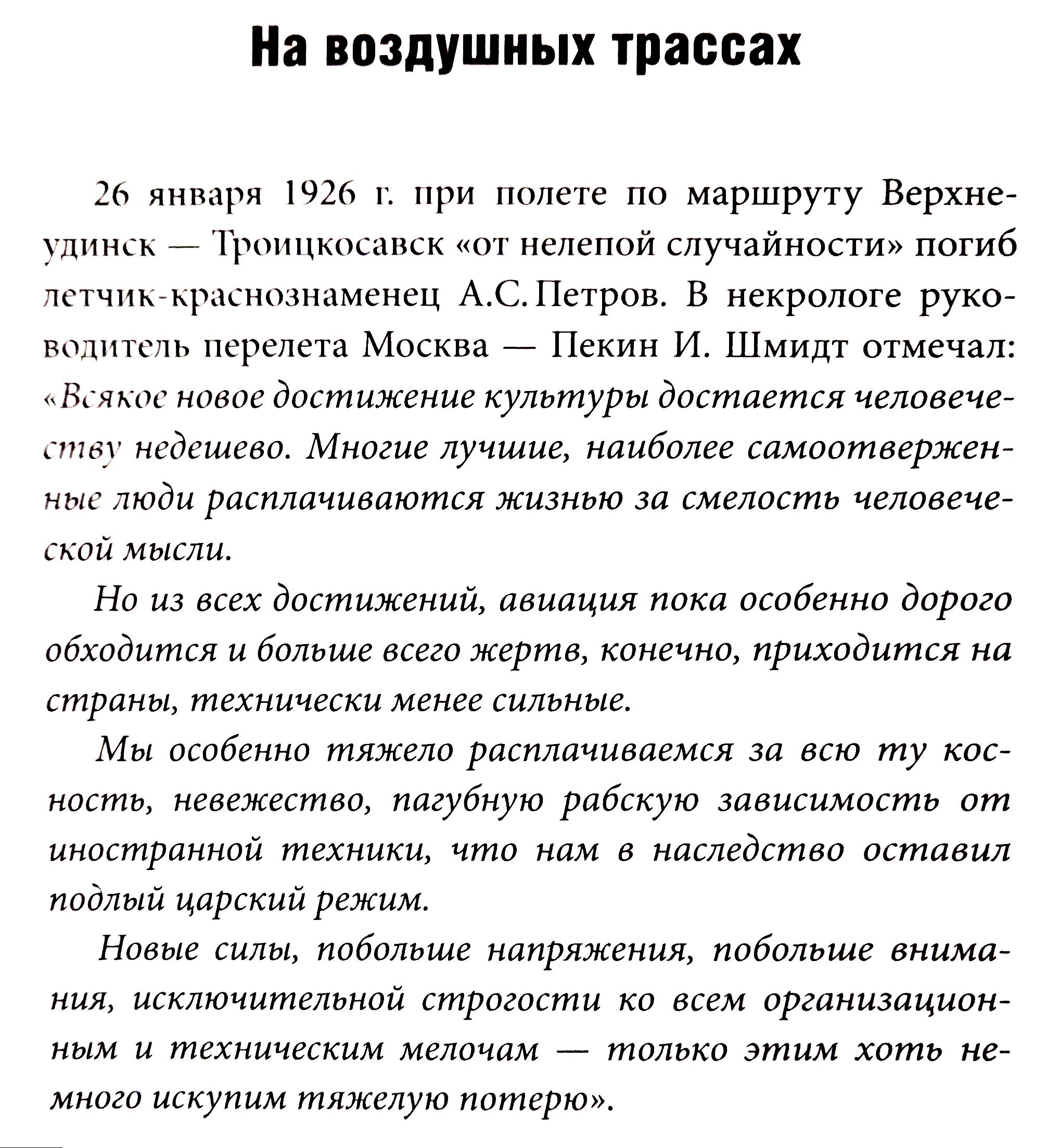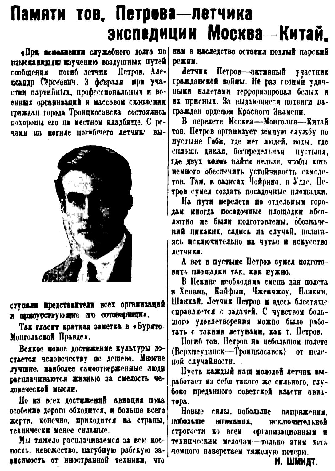 26 января 1926 г. при полете по маршруту Верхнеудинск — Троицкосавск «от нелепой случайности» погиб летчик-краснознаменец А. С. Петров. В некрологе руководитель перелета Москва — Пекин И. Шмидт отмечал: «Всякое новое достижение культуры достается человечеству недешево. Многие лучшие, наиболее самоотверженные люди расплачиваются жизнью за смелость человеческой мысли.