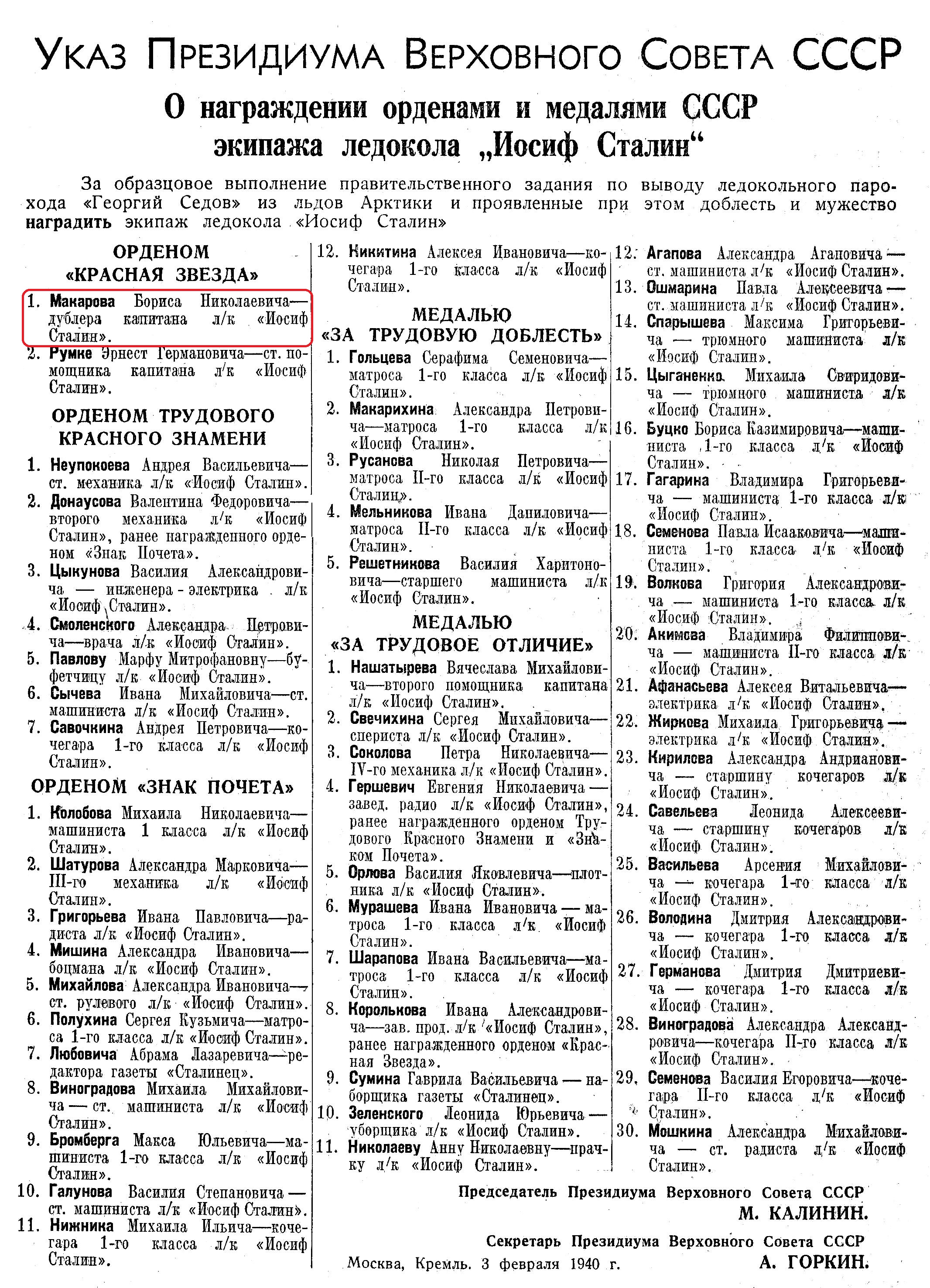 1. Макарова Бориса Николаевича — дублера капитана л/к «Иосиф Сталин».