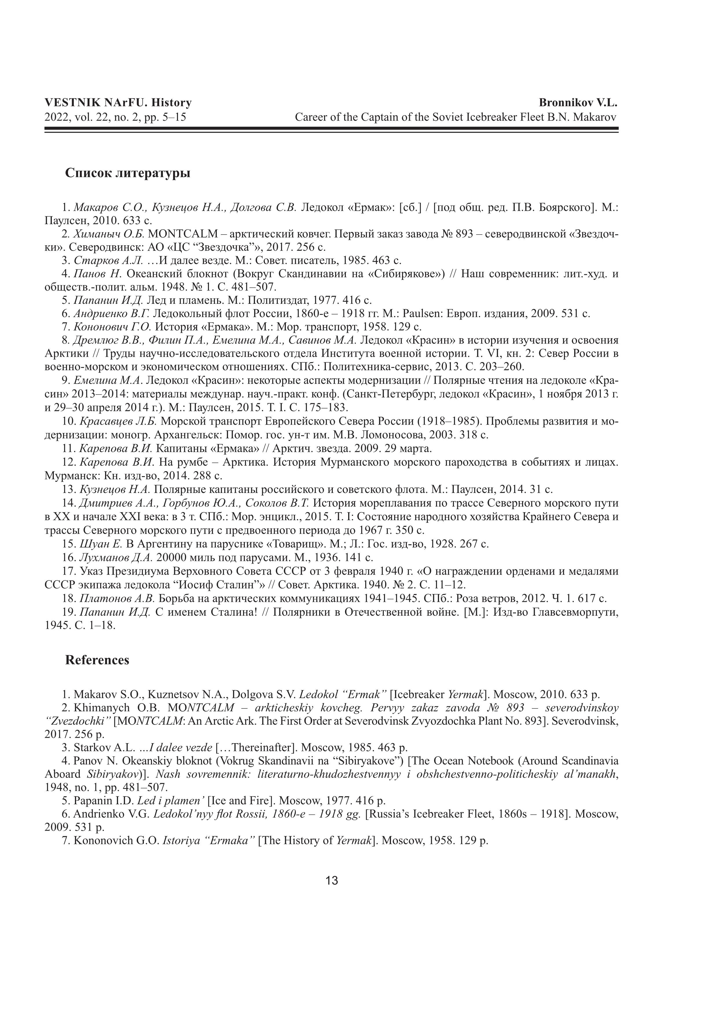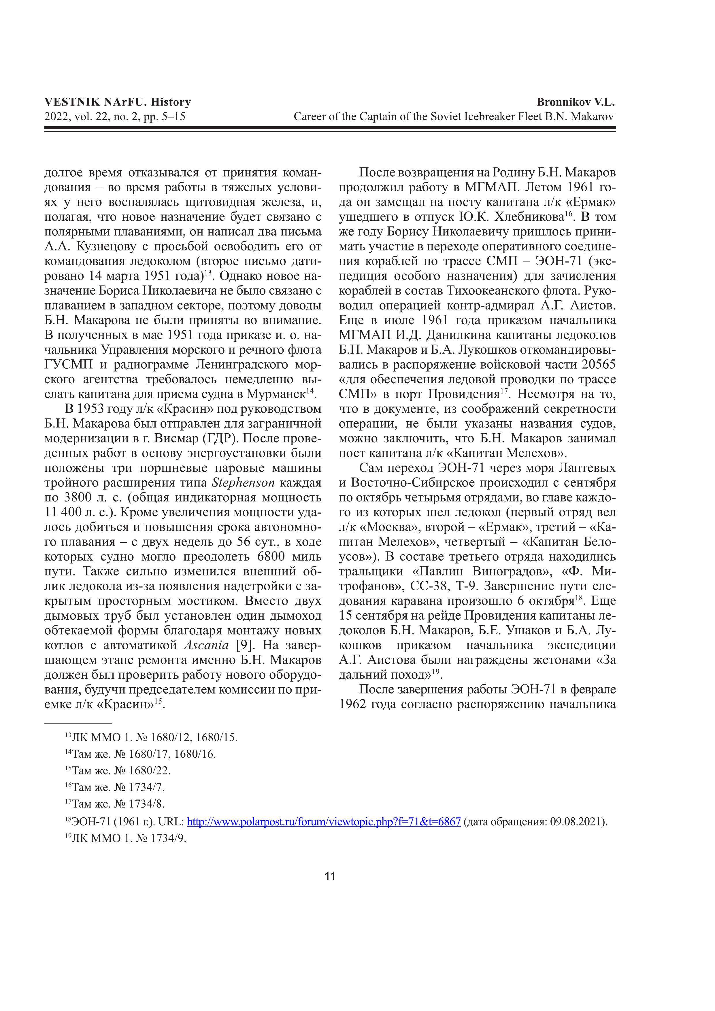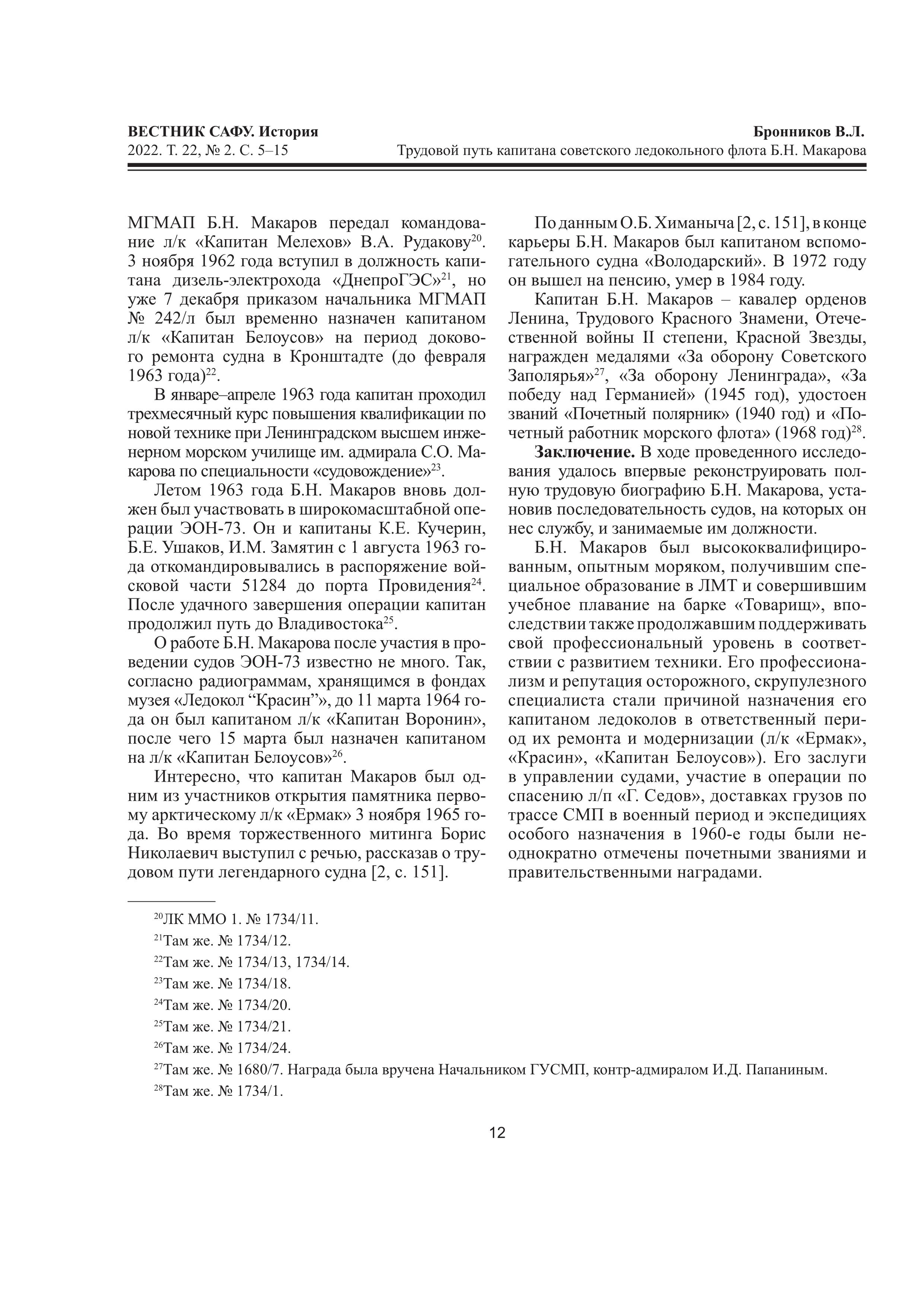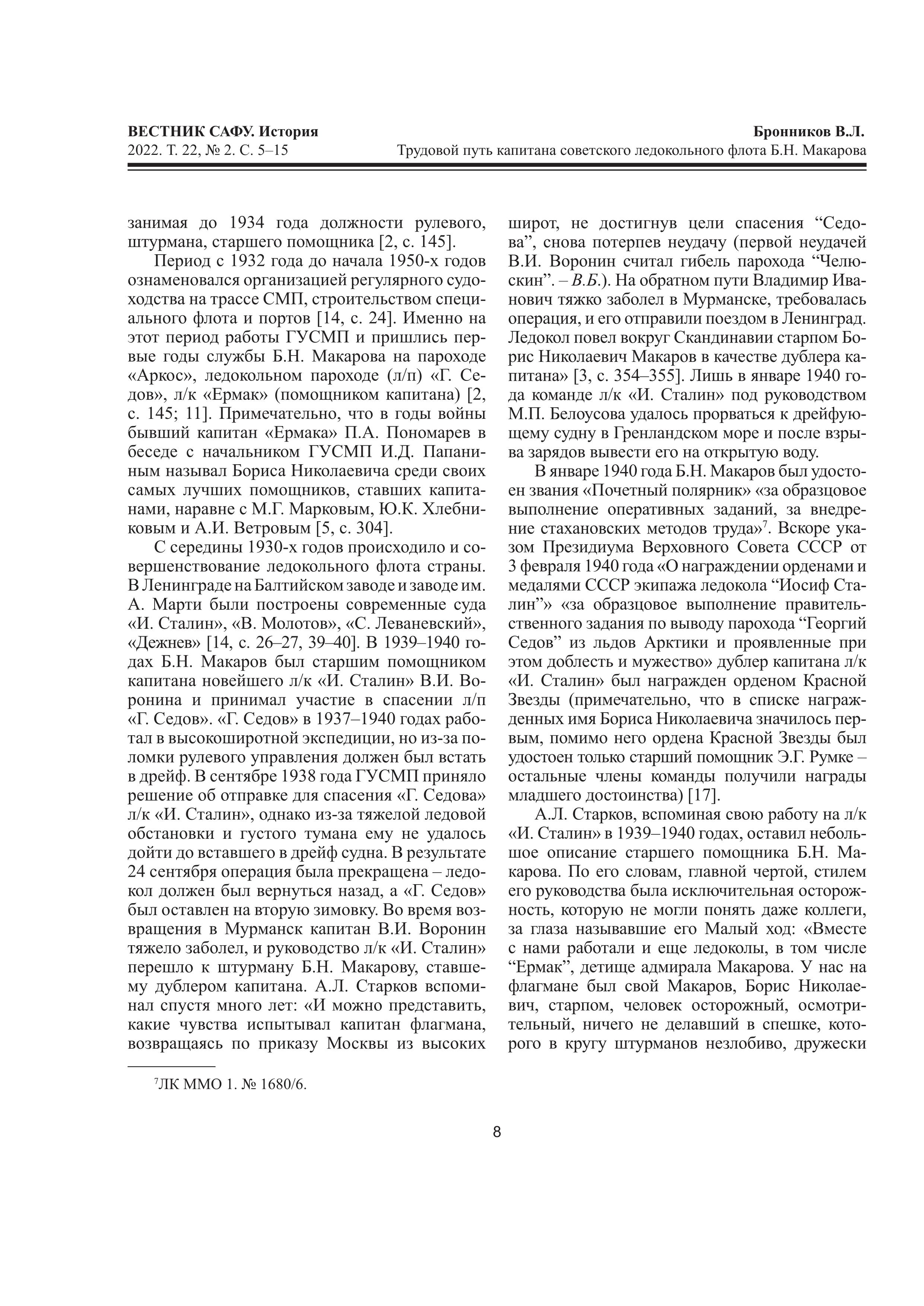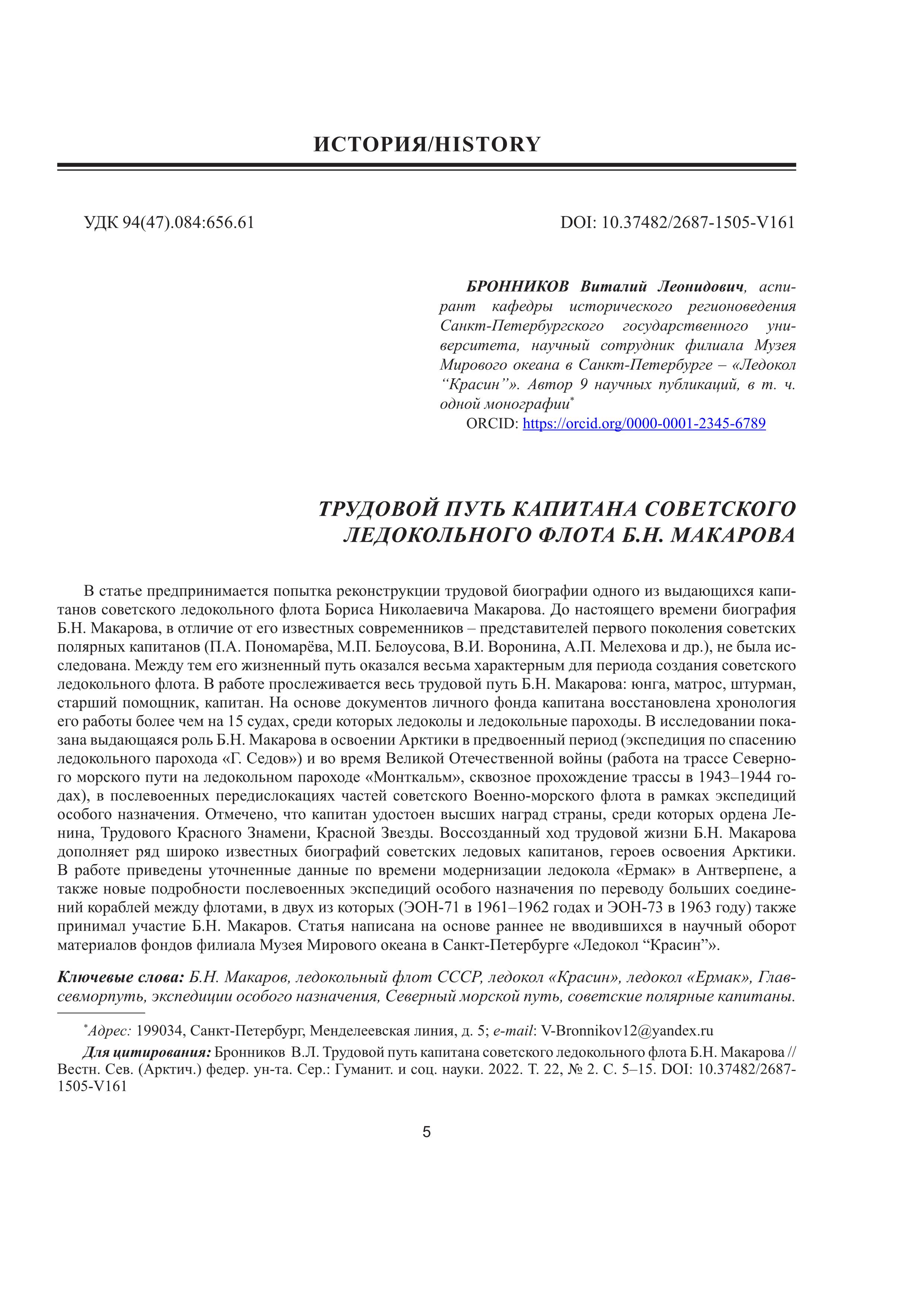 © Бронников В. Л. Трудовой путь капитана советского ледокольного флота Б.Н. Макарова