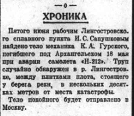 Пятого июня рабочим Лингостровского сплавного пункта И.С. Сапушковым найдено тело механика К.А. Гурского, погибшего под Архангельском 18 мая при аварии самолета "Н-212". Труп случайно обнаружен в р. Лингостровке, между плитками плота, стоящего у берега реки, в нескольких десятках метров от места катастрофы.