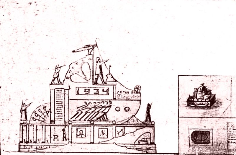 От четвертого варианта остался обобщенный летчик, который должен стоять на носу корабля - и это уже был прототип Валерия Чкалова (как раз в тот период, в 1938-м, он разбился). Фигура должна была венчать «Пантеон летчиков», где было бы место и спасателям челюскинцев, ну а в центре - предполагалось поставить серебряную фигуру Икара.