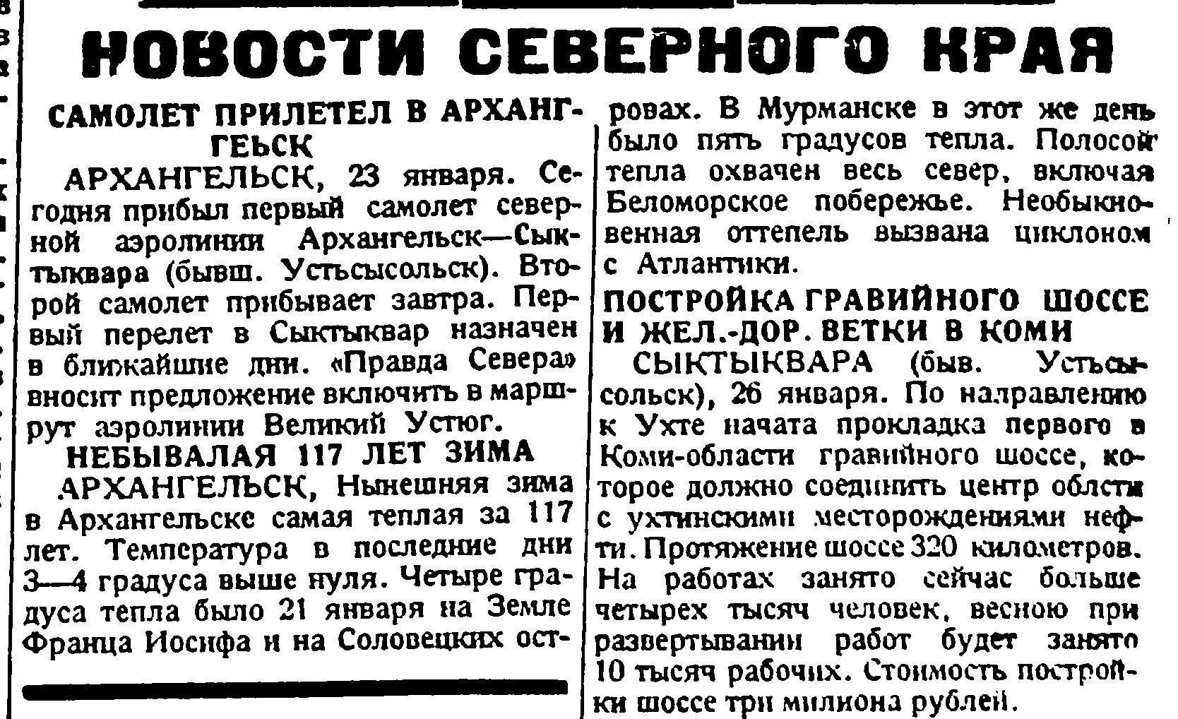 АРХАНГЕЛЬСК, 23 января. Сегодня прибыл первый самолет северной аэролинии Архангельск — Сыктыквара (бывш. Устьсысольск).