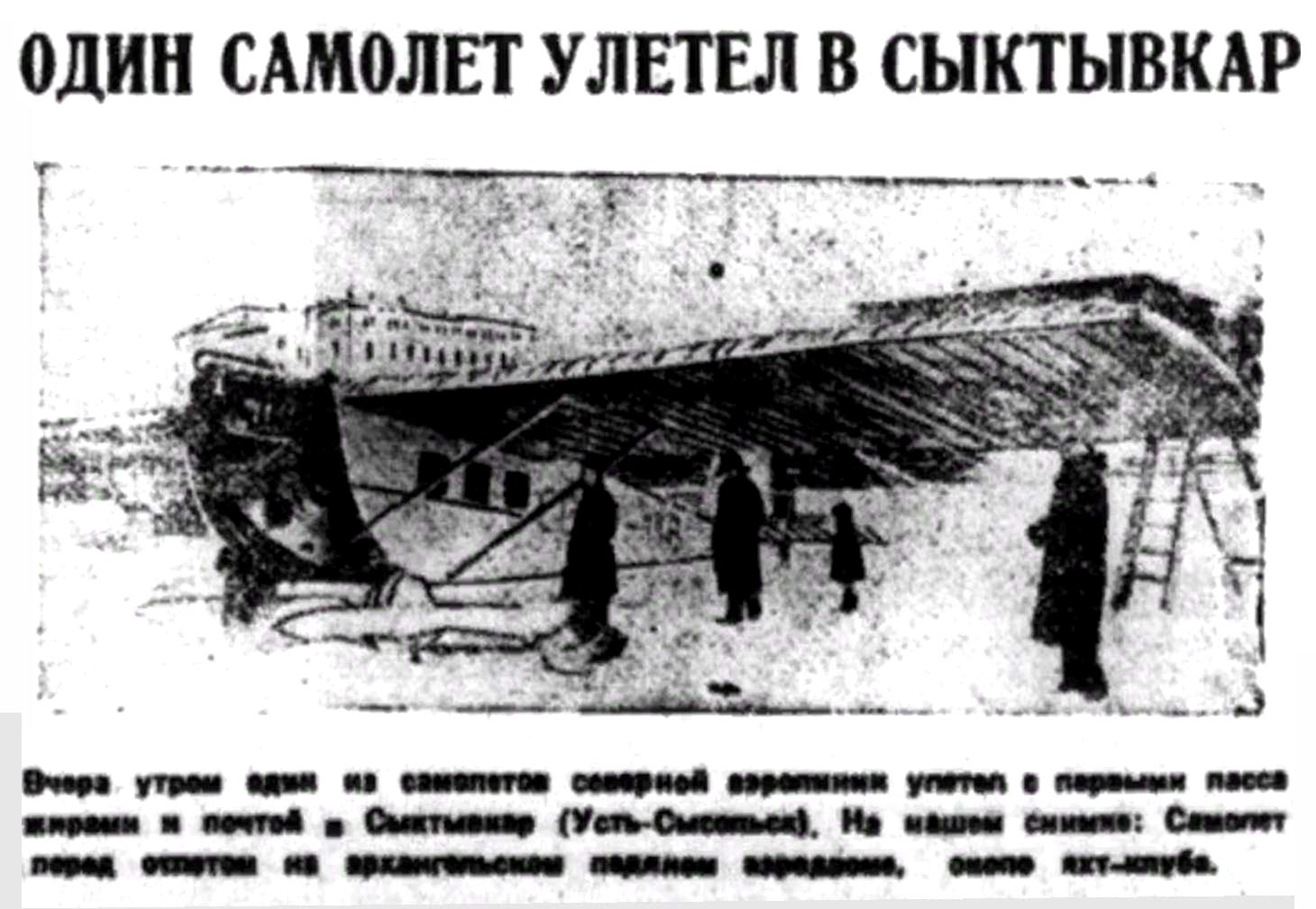 Эта первая регулярная трасса положила начало пассажирским рейсам в Северном крае. В первый год летчики перевезли из Архангельска в Сыктывкар 119 пассажиров и 680 килограммов почты и грузов. Трассу обслуживали летчики И. И. Буняев, Я. В. Бадюлин, К. Н. Гавва, начальник аэростанции (так назывался тогда аэропорт) Д. М. Вершинский.