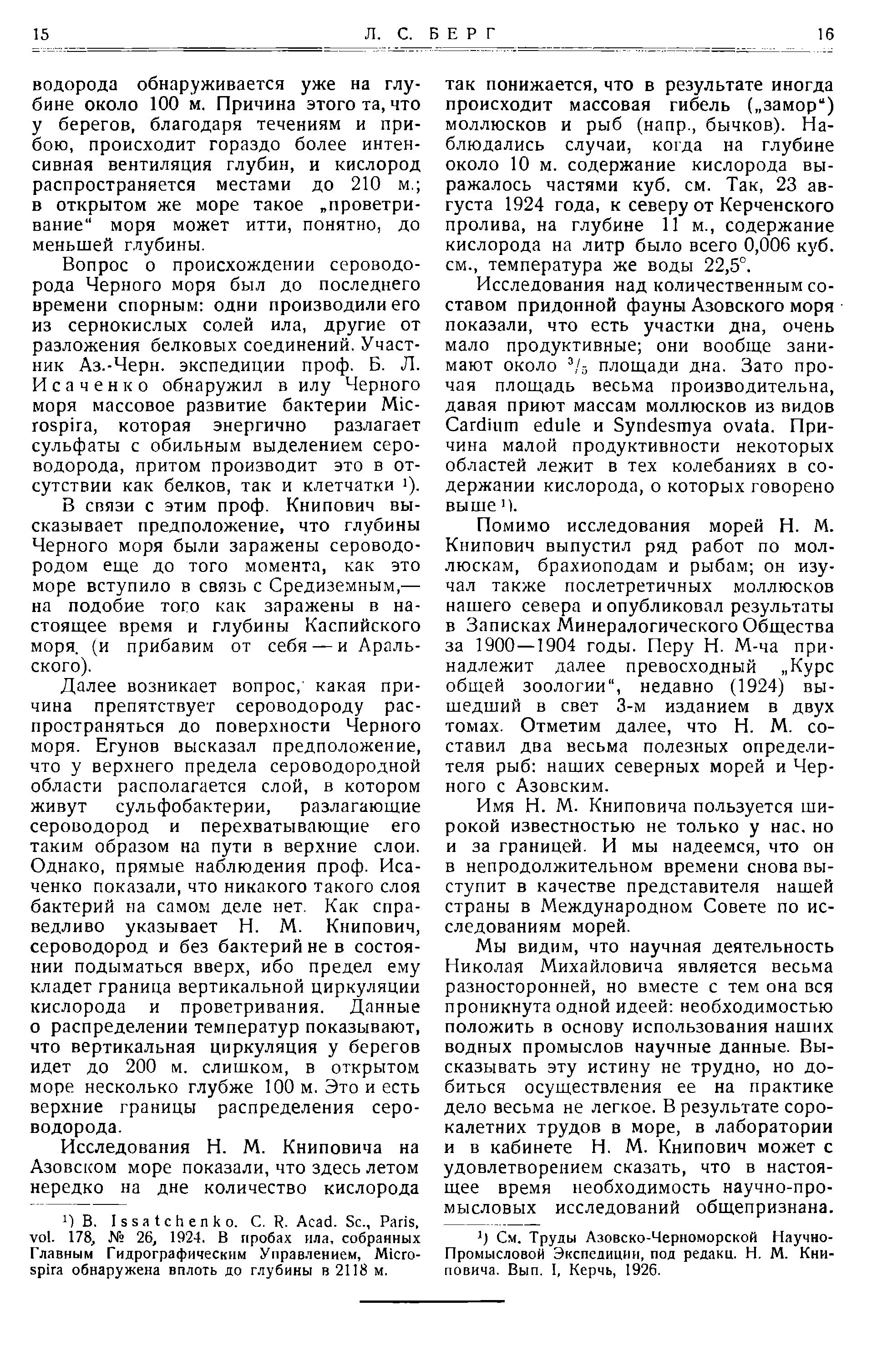 Вопрос о происхождении сероводо-рода Черного моря был до последнего времени спорным: одни производили его из сернокислых солей ила, другие от разложения белковых соединений. Участник Аз.-Черн. экспедиции проф. Б. Л. Исаченко обнаружил в илу Черного моря массовое развитие бактерии Microspira, которая энергично разлагает сульфаты с обильным выделением сероводорода, притом производит это в отсутствии как белков, так и клетчатки 1).