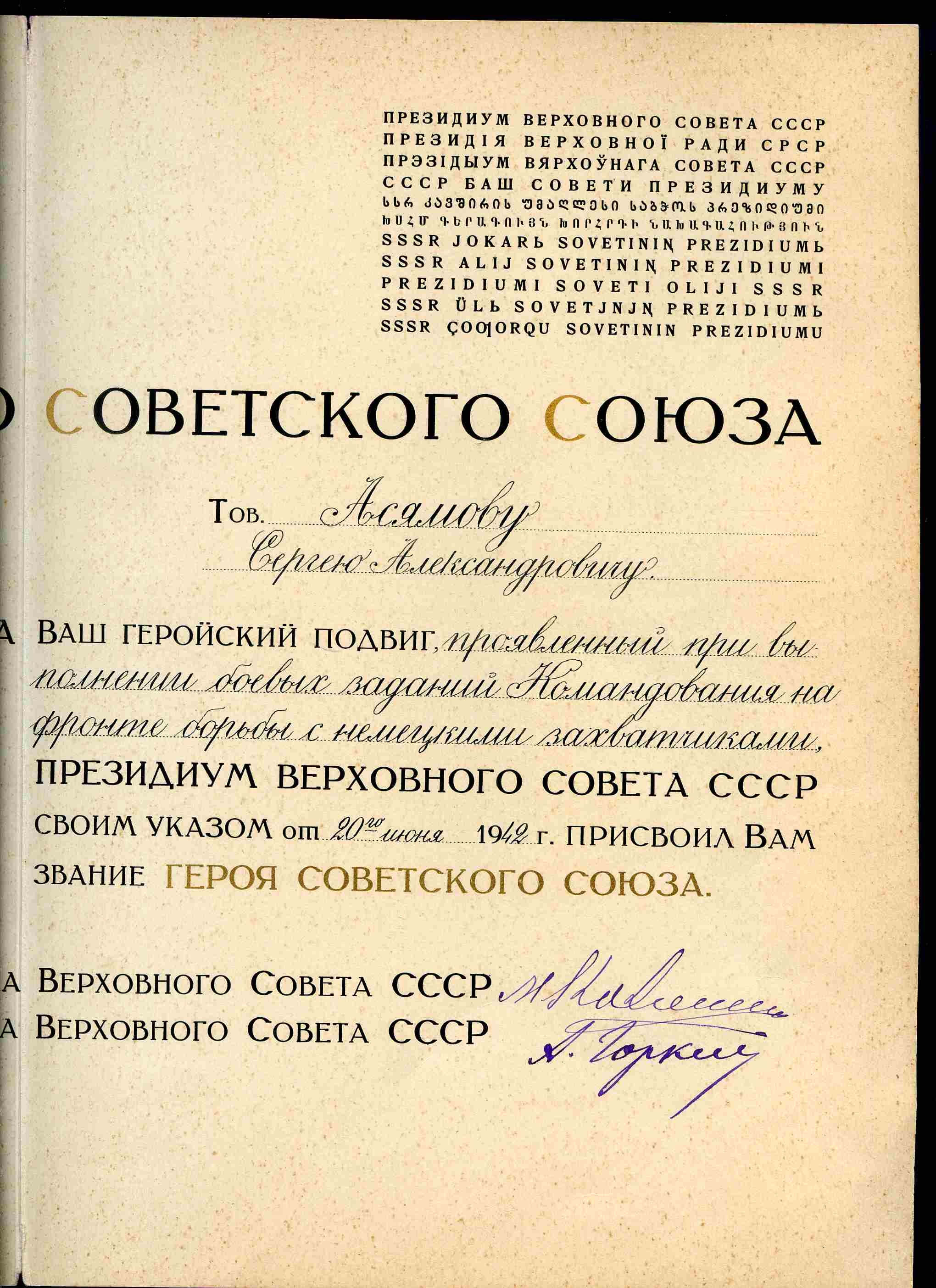 20.06.42 г. С.А.Асямову присвоено звание Героя Советского Союза.