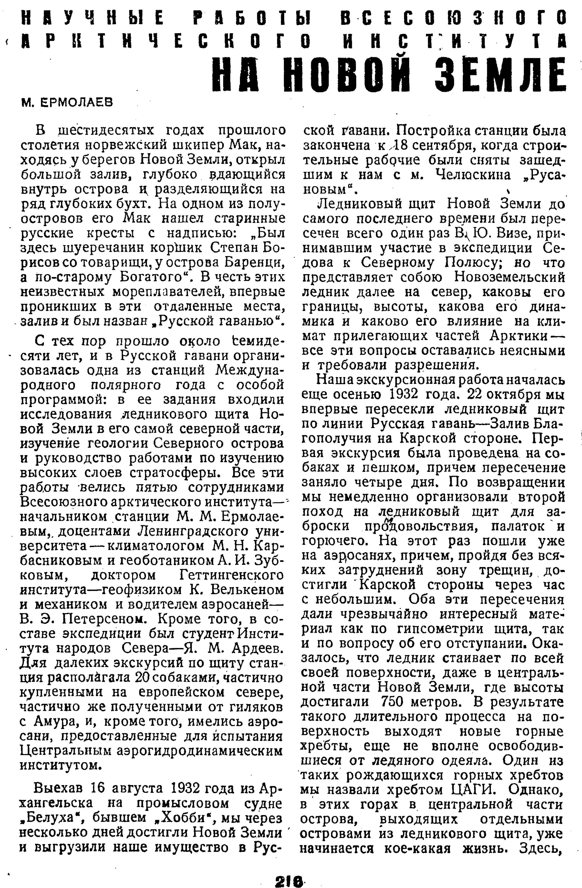 Архангельский капитан И.С. Кокотов взял его юнгой на шхуну "Эльдинг", шедшую в 1925м вокруг Новой Земли. Здоровье пошло на поправку, но юноша "заболел" Арктикой. Из Архангельска он уйдет еще в десять экспедиций! А уже в первой зимовке на острове Большой Ляховский он (в 24 года) открыл явление и дал ему имя - "термокарст". В 26 лет авторитет Ермолаева в научном мире так высок, что его принимают в общество "Аэроарктик", созданное Фритьофом Нансеном для изучения полярных стран летательными аппаратами, и в Национальное географическое общество США!