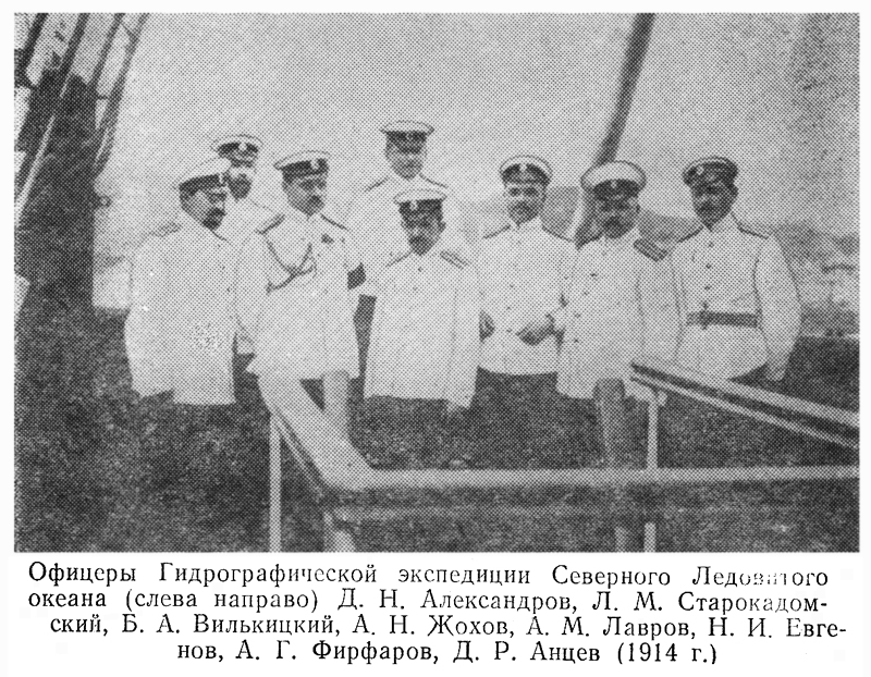 Участники ГЭСЛО (слева направо): Капитан 2-го ранга Инженер-Механик Д. В. Александров (о котором много писали в ветке "Морские Летчики"), судовой врач Л. М. Старокадомский, Вилькицкий, Лейтенанты: А. Н. Жохов. А. М. Лавров, Н. И. Евгенов, механик Фирфанов, Мичман Д. Р. Анцев. Владивосток. 1914
