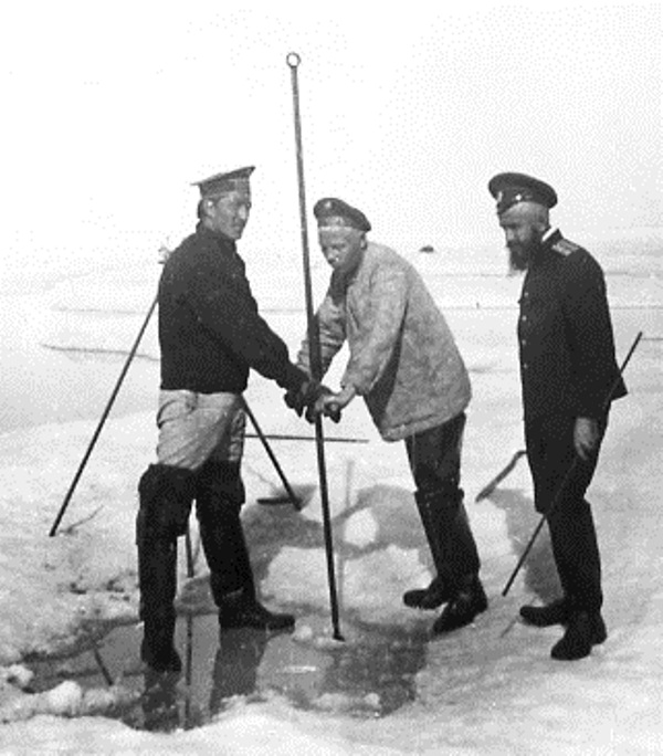 1915 год. Измерение толщины льда. Справа А.М. Лавров