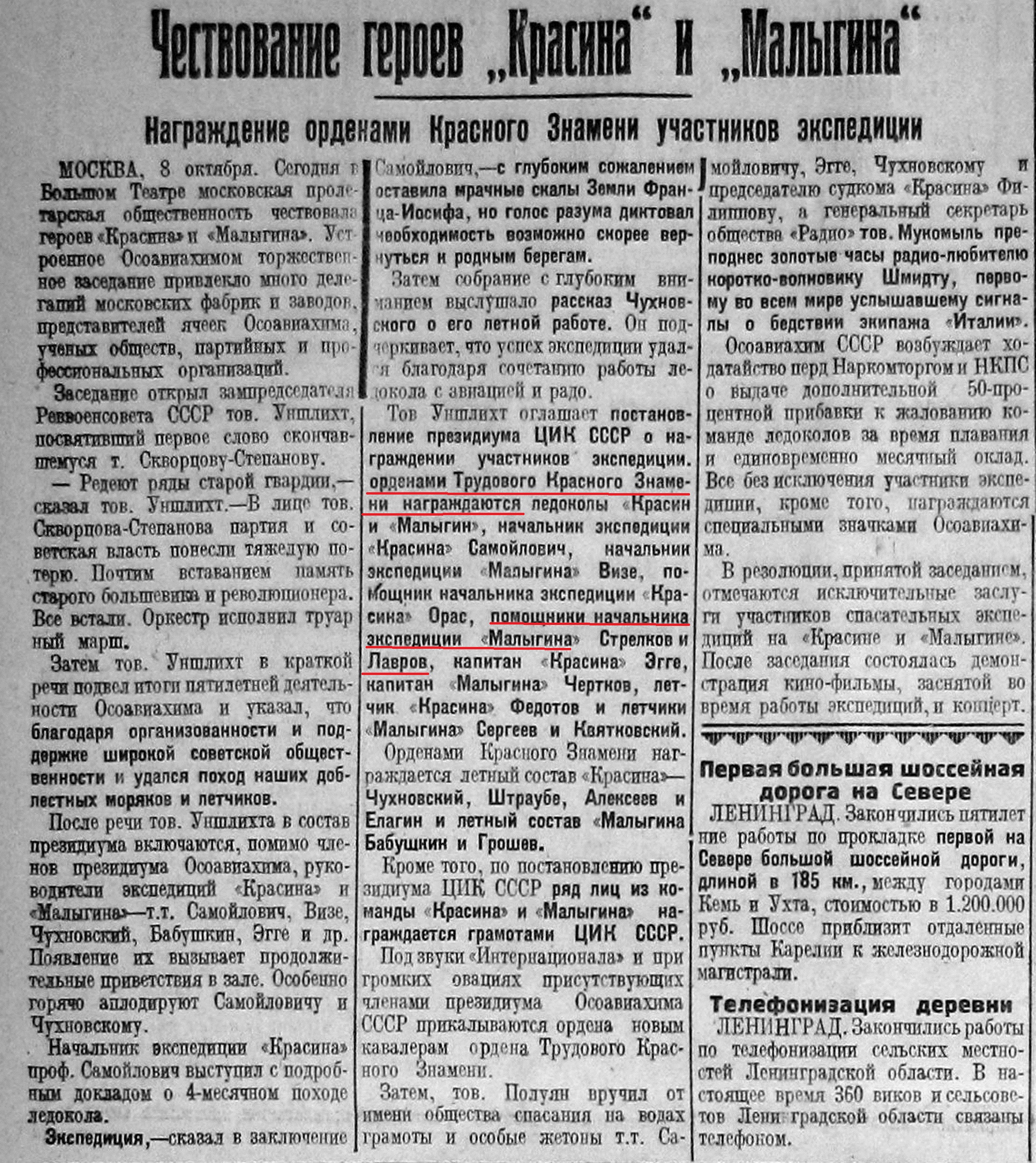 в 1928 году помощником начальника экспедиции участвовал в плавании л/п «Малыгин» по спасению экипажа дирижабля «Италия»