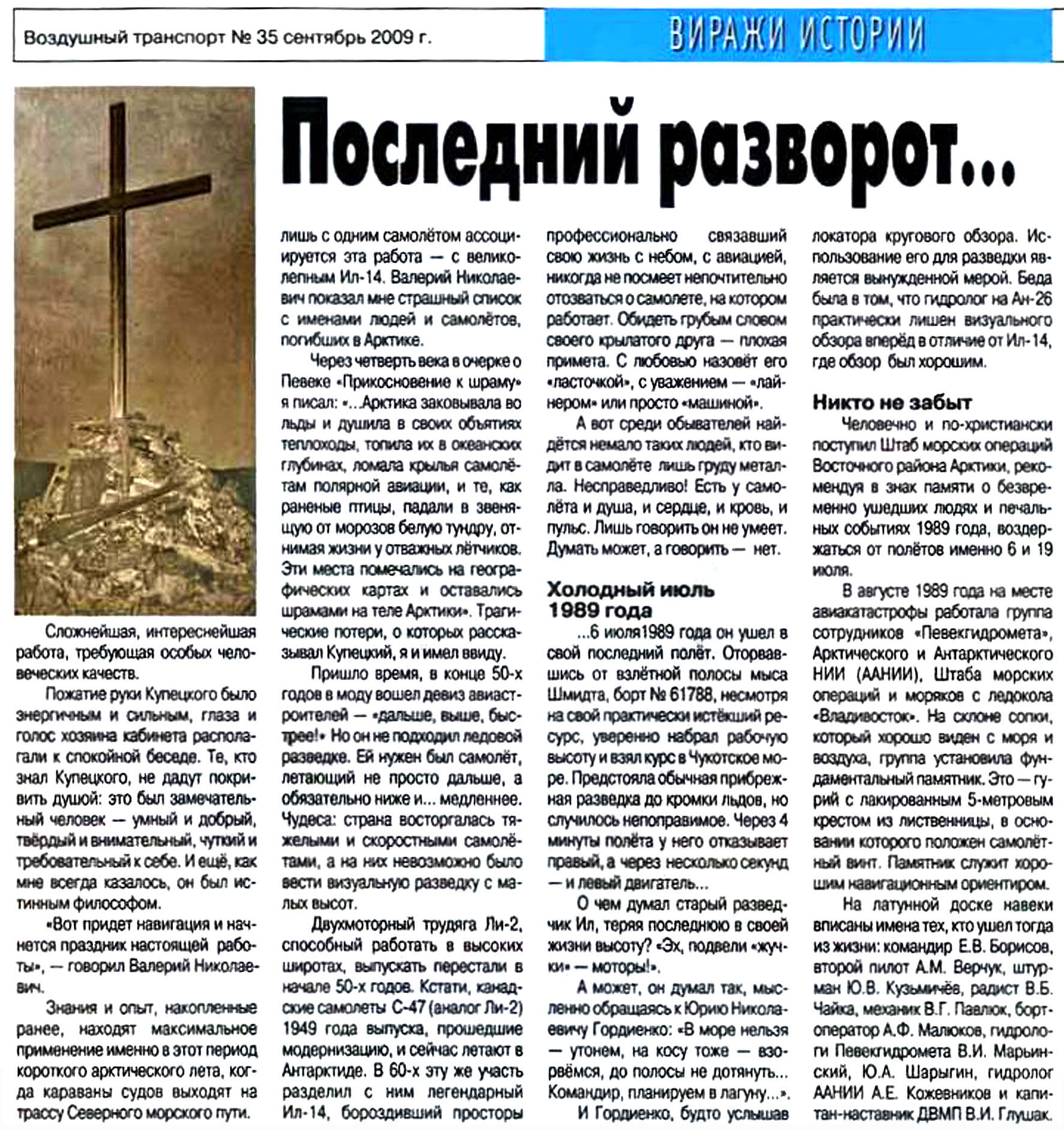 Кстати, еще в советские времена Купецкий умудрился опубликовать отчет об одной из самых успешных экспедиций в Северном Ледовитом океане — экспедиции на ледоколах «Таймыр» и «Вайгач». Она замалчивалась у нас десятки лет только из-за того, что одним из ее руководителей был будущий белый адмирал Колчак. Издав научный отчет об этом историческом событии, Купецкий, по сути, воздвиг ему достойный памятник. Я уверен, что памятника достоин и он сам. И об этом его друзьям стоит подумать. Как-то Купецкий прислал мне свою статью. В ней говорилось о катастрофах самолетов ледовой разведки. Он перечислял эти трагические события и называл погибших товарищей: 1959 год — о скалу мыса Шалагского разбивается Ли-2, 1963 год — на ледник Земли Франца-Иосифа падает Ил-14, 1981 год — катастрофа на Шантарских островах в Охотском море, 1989 год — авария на Чукотке... В статье Купецкий ставил вопрос об устаревшей авиационной технике, на которой гидрологам приходилось выполнять ледовую разведку. И вот 6 июля 1990 года терпит бедствие последний в Арктике Ил-14. А вместе с ним — и Купецкий, на борту которого он летел. Но удача на этот раз сберегла его. Как оказалось, на целых 10 лет.