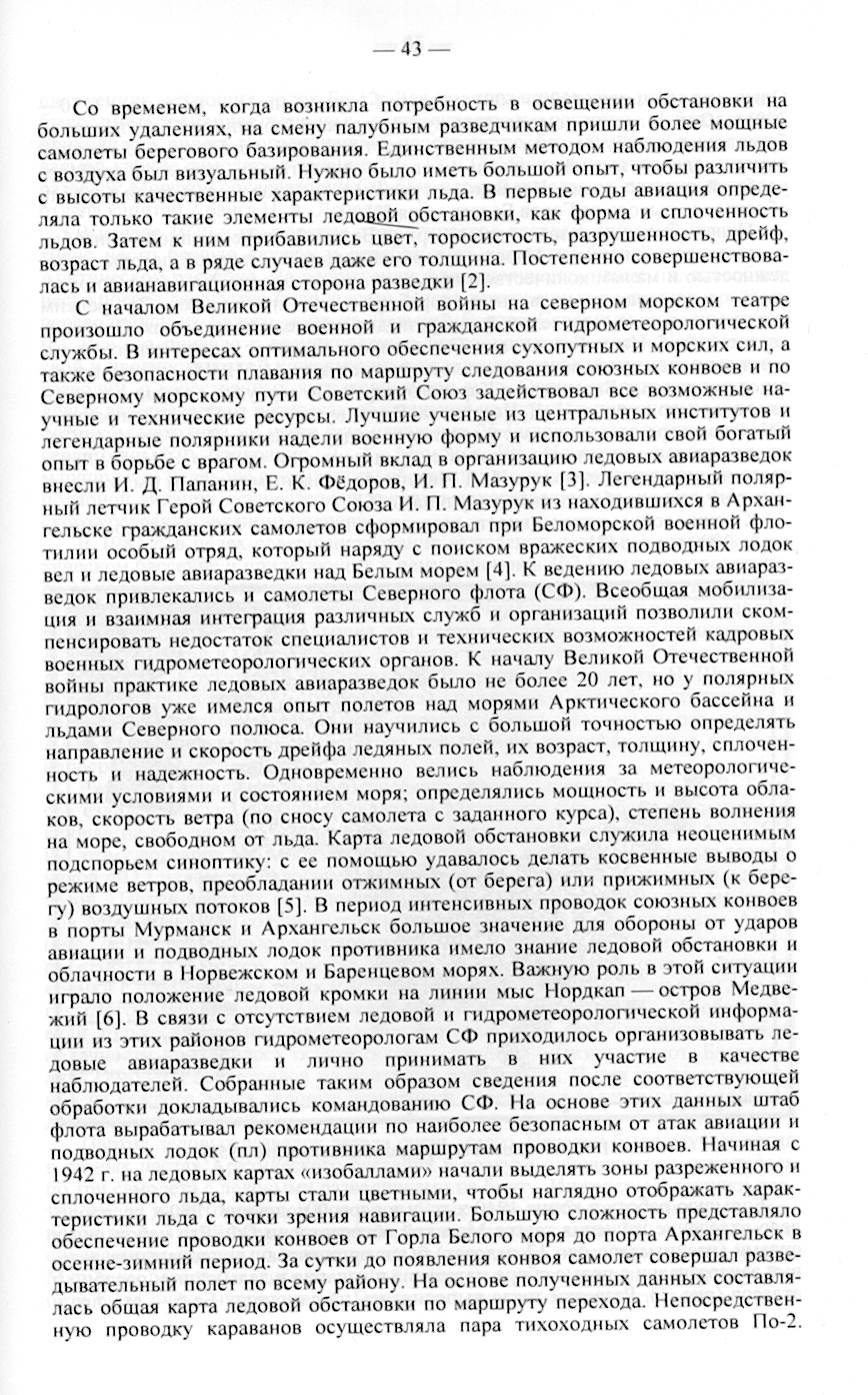 С началом Великой Отечественной войны на северном морском театре произошло объединение военной и гражданской гидрометеорологической службы. В интересах оптимального обеспечения сухопутных и морских сил. а также безопасности плавания по маршруту следования союзных конвоев н по Северному морскому пути Советский Союз задействовал все возможные научные и технические ресурсы. Лучшие ученые из центральных институтов и легендарные полярники надели военную форму И использовали свой богатый опыт в борьбе с врагом. Огромный вклад в организацию ледовых авиаразведок внесли И. Д. Папаннн, Г... К. Федоров. И. П. Мазурук [3]. Легендарный полярный летчик Герой Советского Союза И. П. Мазурук из находившихся в Архангельске гражданских самолетов сформировал при Беломорской военной флотилии особый отряд, который наряду с поиском вражеских подводных лодок вел и ледовые авиаразведки над Белым морем (4). К ведению ледовых авиаразведок привлекались и самолеты Северного флота (СФ). Всеобщая мобилизация и взаимная интеграция различных служб и организаций позволили скомпенсировать недостаток специалистов и технических возможностей кадровых военных гидрометеорологических органов. К началу Великой Отечественной войны практике ледовых авиаразведок было не более 20 лет. но у полярных гидрологов уже имелся опыт полетов над морями Арктического бассейна и льдами Северного полюса. Они научились с большой точностью определять направление и скорость дрейфа ледяных полей, их возраст, толщину, сплоченность и надежность. Одновременно велись наблюдения за метеорологическими условиями и состоянием моря; определялись мощность и высота облаков, скорость ветра (по сносу самолета с заданного курса), степень волнения на море, свободном от льда. Карта ледовой обстановки служила неоценимым подспорьем синоптику: с ее помощью удавалось делать косвенные выводы о режиме ветров, преобладании отжимных (от берега) или прижимных (к берегу) воздушных потоков [5]. В период интенсивных проводок союзных конвоев в порты Мурманск и Архангельск большое значение для обороны от ударов авиации и подводных лодок противника имело знание ледовой обстановки и облачности в Норвежском и Баренцевом морях. Важную роль в этой ситуации играло положение ледовой кромки на линии мыс Нордкап — остров Медвежий [6|. В связи с отсутствием ледовой и гидрометеорологической информации из этих районов гидрометеорологам СФ приходилось организовывать ледовые авиаразведки и лично принимать в них участие в качестве наблюдателей. Собранные таким образом сведения после соответствующей обработки докладывались командованию СФ. На основе этих данных штаб флота вырабатывал рекомендации по наиболее безопасным от атак авиации и подводных лодок (пл) противника маршрутам проводки конвоев. Начиная с 1942 г. на ледовых картах «изобаллами» начали выделять зоны разреженного и сплоченного льда, карты стати цветными, чтобы наглядно отображать характеристики льда с точки зрения навигации. Большую сложность представляло обеспечение проводки конвоев от Горла Белого моря до порта Архангельск в осенне-зимний период. За сутки до появления конвоя самолет совершай разведывательный полет по всему району. На основе полученных данных составлялась общая карта ледовой обстановки по маршруту перехода. Непосредств