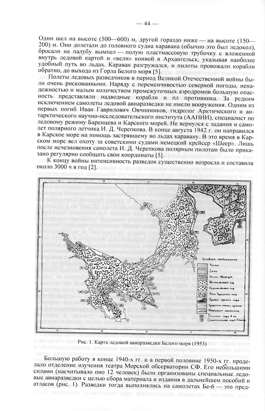 Большую работ) в конце 1940-х гг. и в первой половине 1950-х гг. проделало отделение изучения театра Морской обсерватории СФ. Его небольшими силами (насчитывало оно 12 человек) были организованы специальные ледовые авиаразведки с целью сбора материала и издания в дальнейшем пособий и атласов (рис. I). Разведки тогда выполнялись на самолетах Бе-6 — это предшественник летающих лодок Бе-12. Для полетов на ледовую разведку нужно было иметь отменное здоровье, выносливость и мужество. Наблюдателям приходилось сидеть в ограниченном пространстве, без движения, в неотапливаемой кабине самолета в течение 10—12 ч [7]. Одним из ветеранов ледовых разведок Морской обсерватории СФ был первый начальник гидрологического отдела капитан 2 ранга Н. Л. Лебедев.