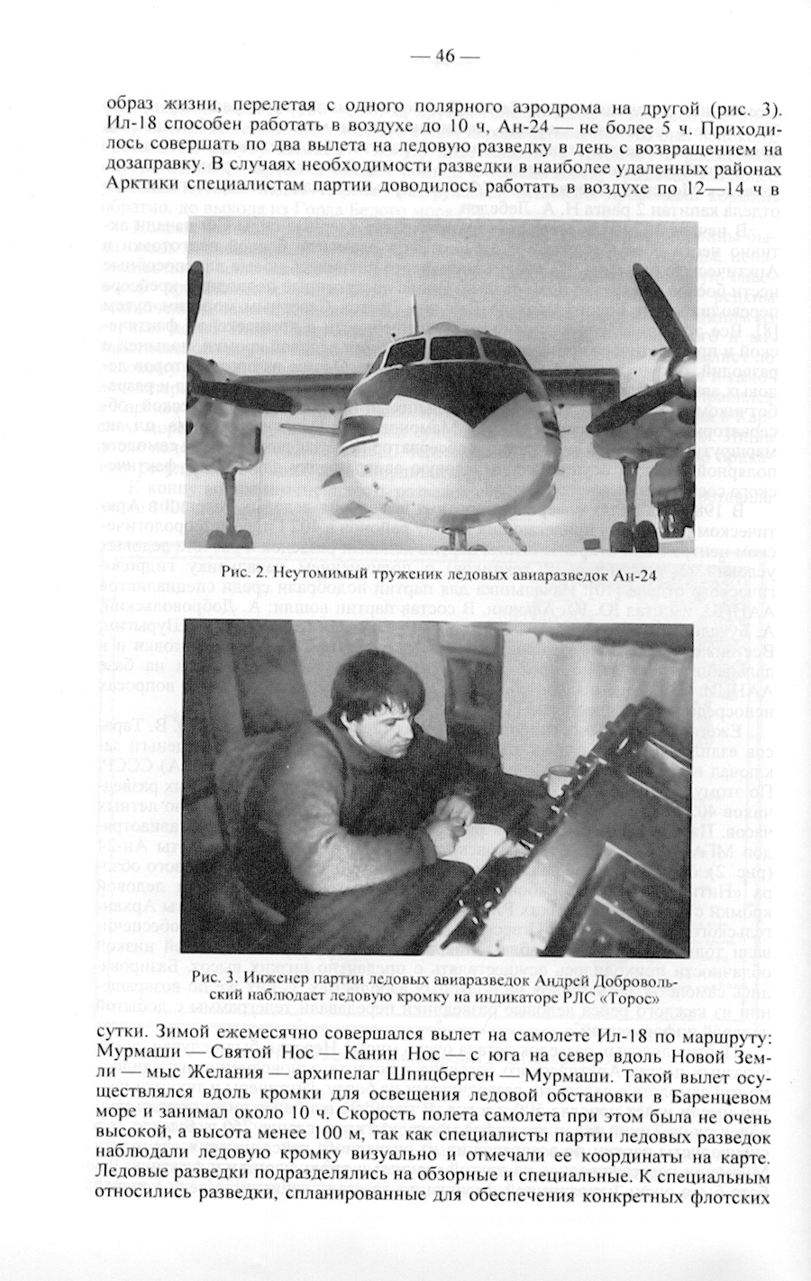 Ежегодно начальник гидрологического отдела капитан 2 ранга Ю. В. Тарасов ездил в Москву, где на выделенные Министерством обороны деньги заключал на год договор с Министерством гражданской авиации (МГА) СССР. По этому договору МГА обязывалось обеспечить, в интересах ледовых разведчиков 402 Гидрометеорологического центра определенное количество летных часов. Партия ледовых разведок работала на самолетах нескольких авиаотрядов МГА СССР. В состав Быковского авиаотряда входили самолеты Ан-24 (рис. 2). оборудованные радиолокационными станциями (РЛС) бокового обзора «Нить» и «Торос». Рабочая высота инструментальной съемки ледовой кромки с применением таких РЛС составляла около 6000 м. Самолеты Архангельского, Мячковского и Игарского полярных авиаотрядов (Ил-14) обеспечивали только визуальные наблюдения, которые из-за преобладающей низкой облачности приходилось осуществлять с предельно низких высот. Базировались самолеты авиаотрядов на полярных аэродромах. С них же по возвращении из каждого рейса ледовые разведчики передавали телеграммы с добытой ледовой информацией.
