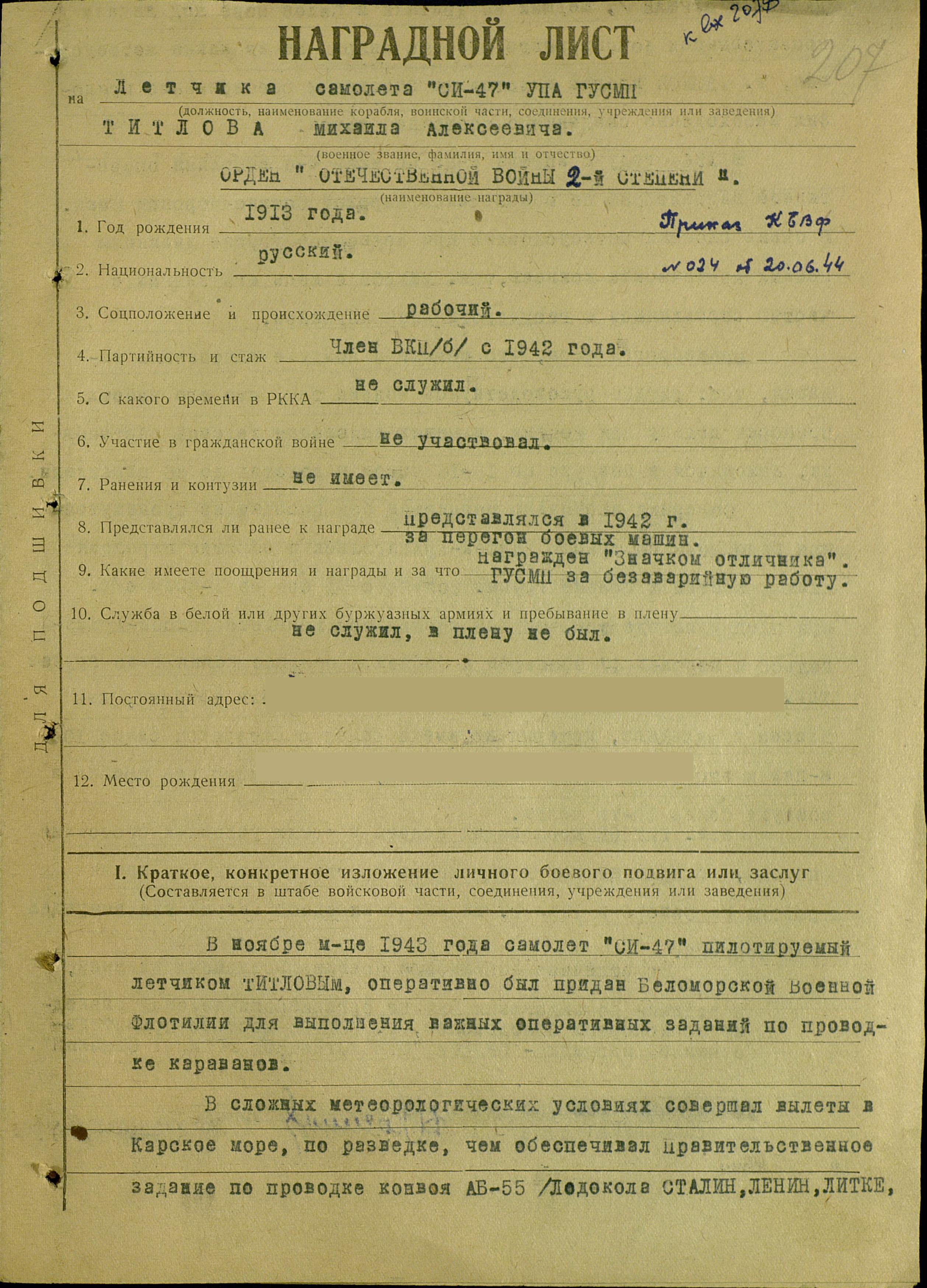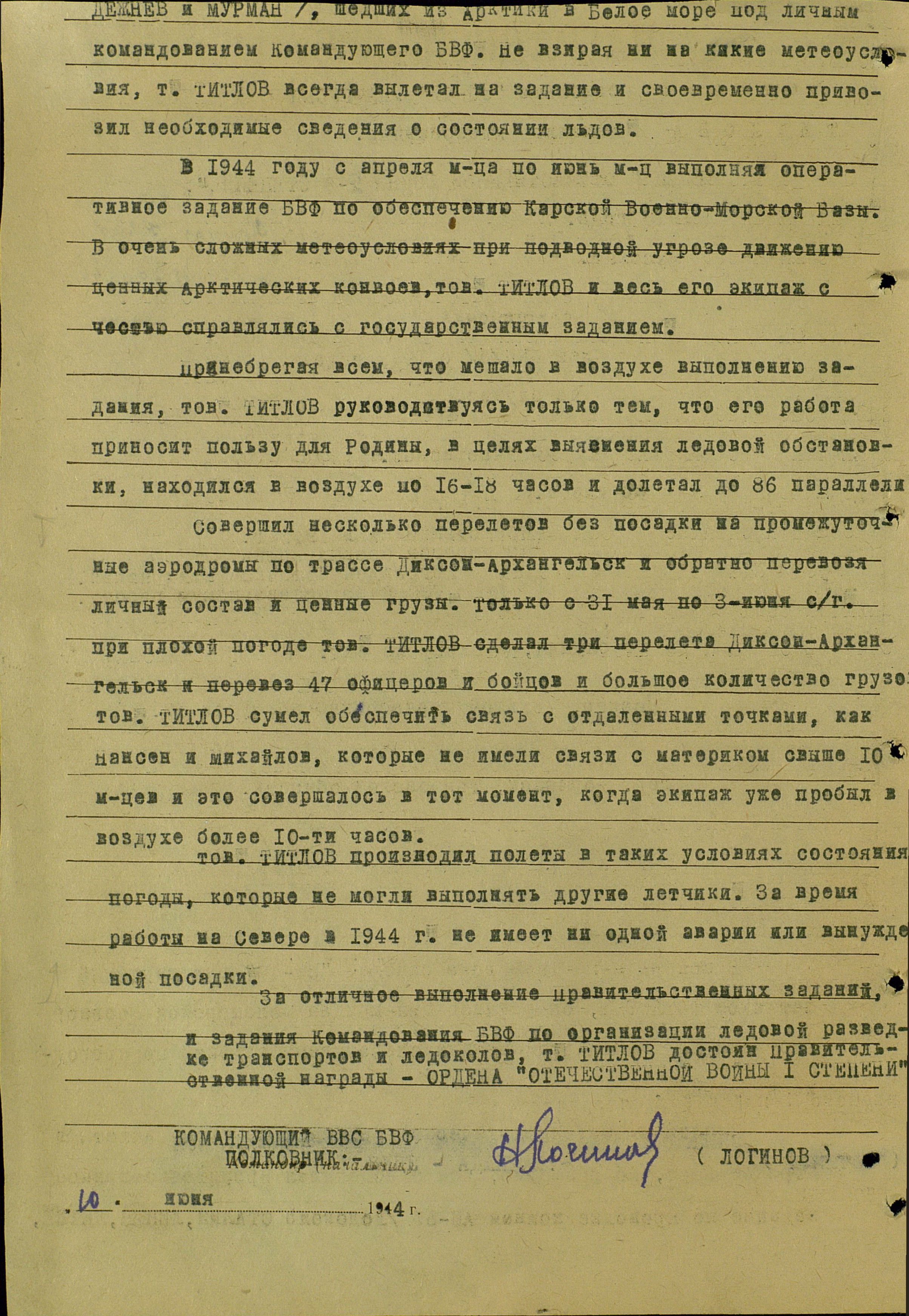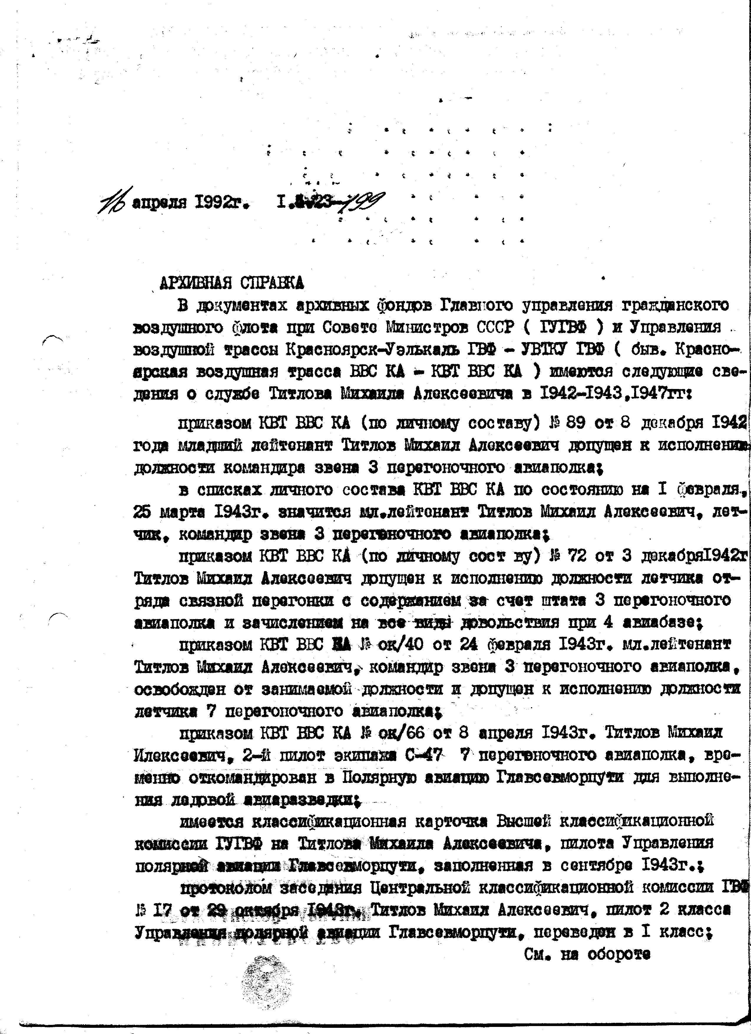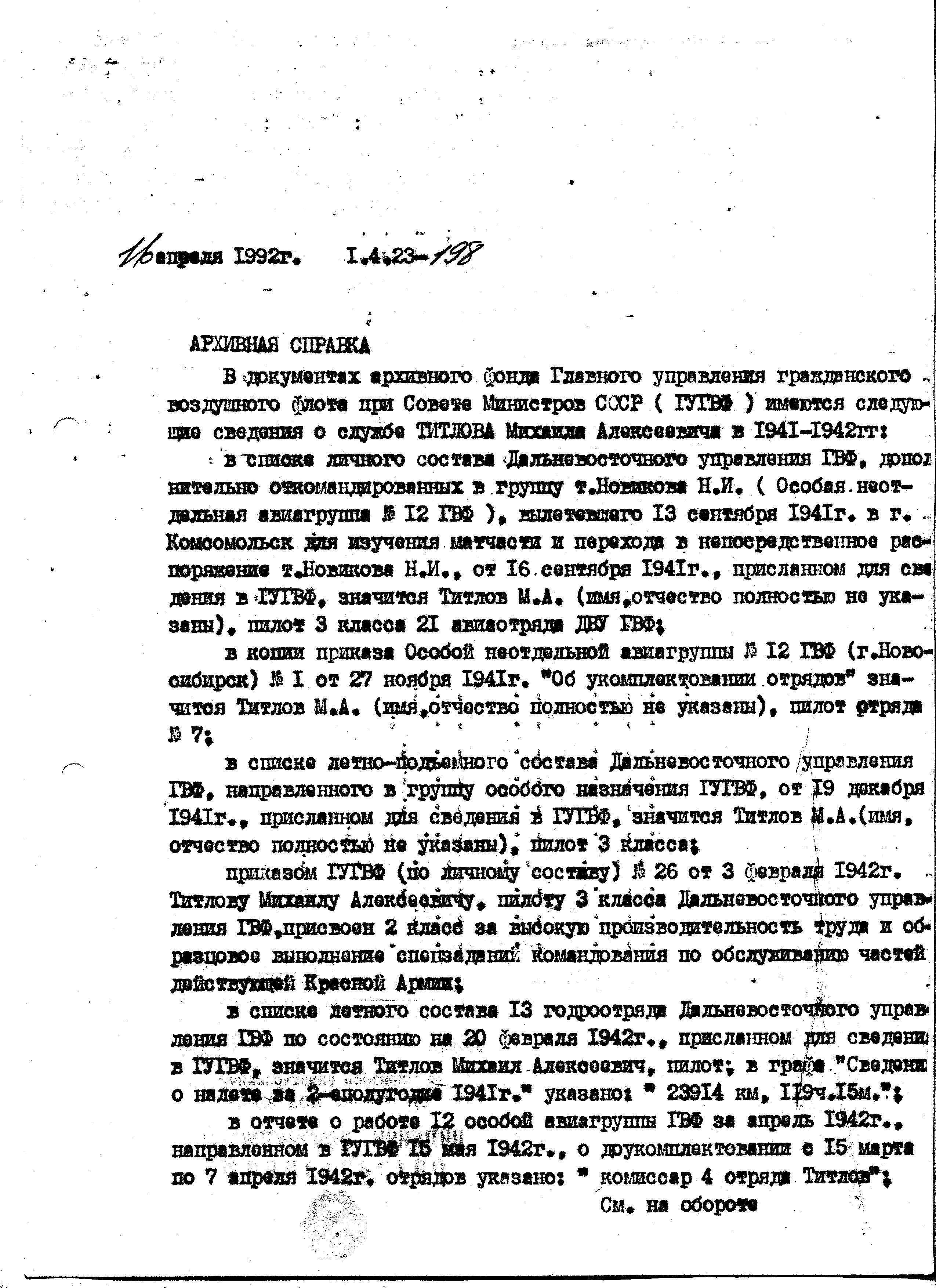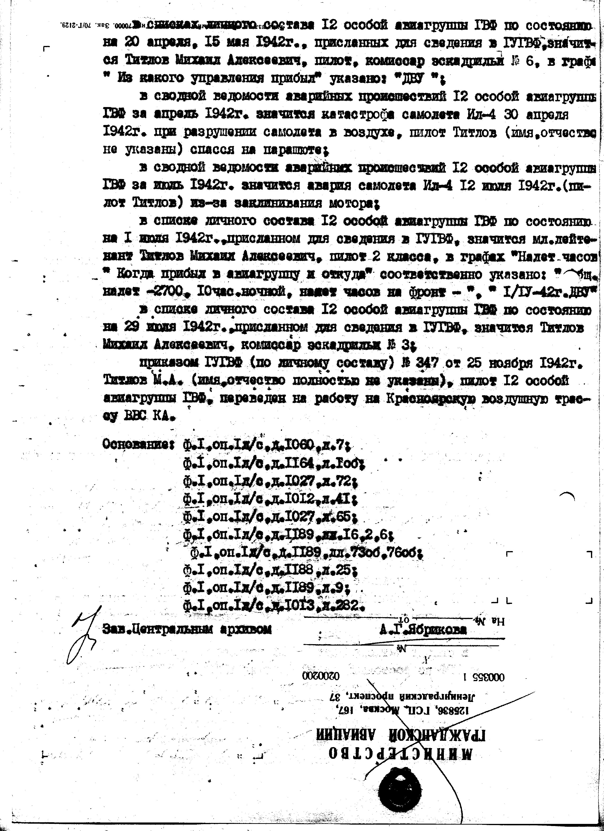 Сообщаем, что документы Дальневосточного управления ГВФ, Особой неотдельной авиагруппы № 12 ГВФ, 12 особой авиагруппы ГВФ на хранение в Центральный архив не поступали, документы Управления полярной авиации Главсевморпути за военные годы хранятся в быв.архиве Министерства морского флота СССР (Москва, ул. Обручева, д.27а, т.209-7928 поэтому подтвердить полностью службу Титлова М.А. приказами о назначении, перемещении и увольнении в 1941-1945гг. не представляется