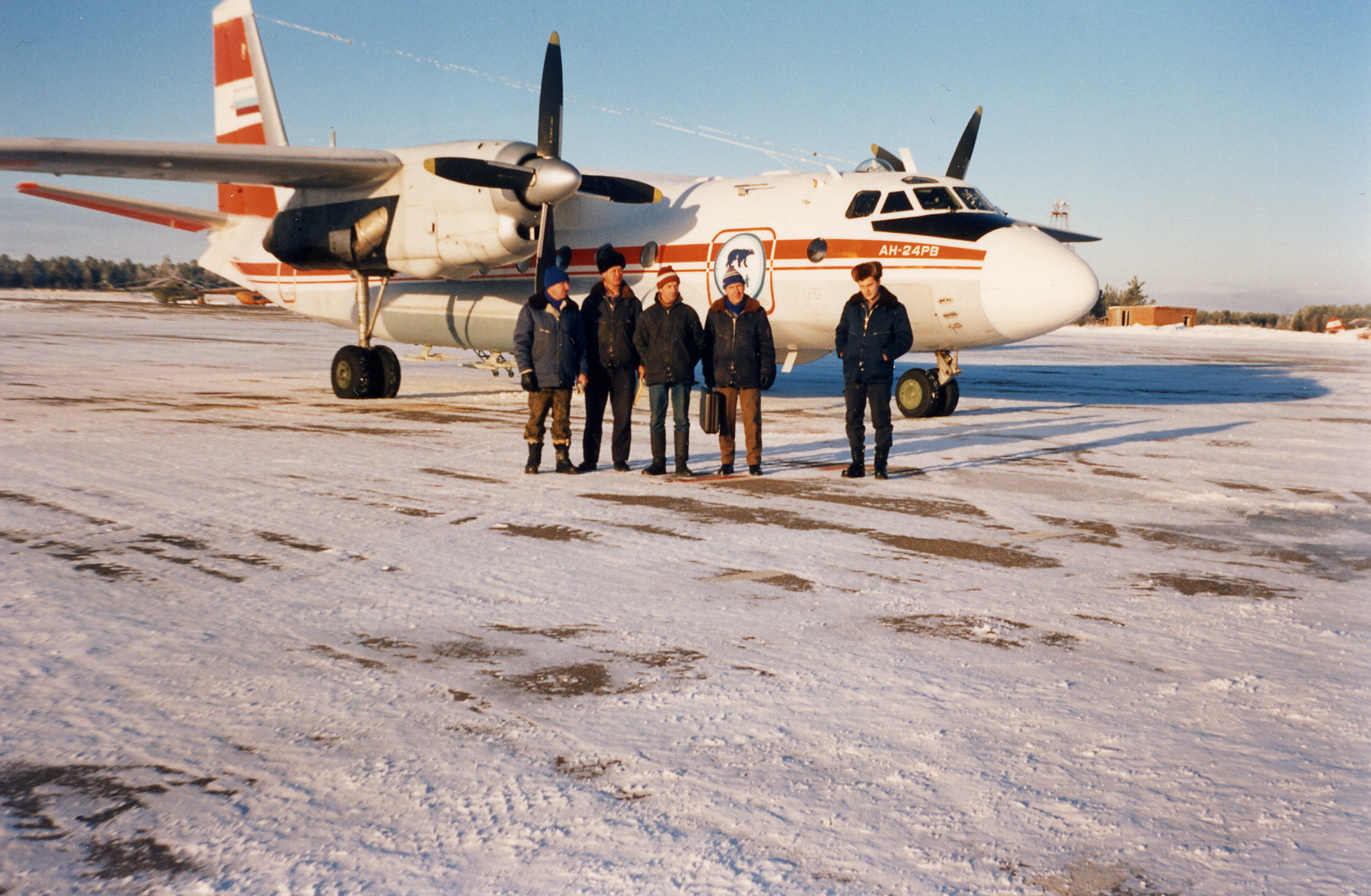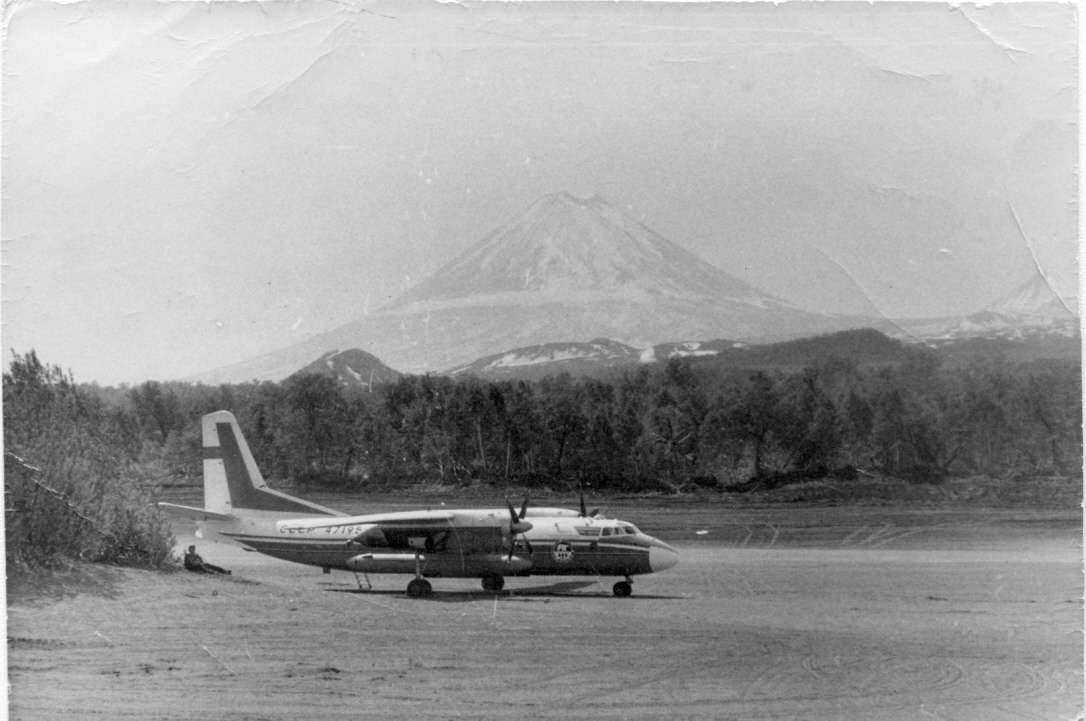 "Бурлаки" на о. Св. Лаврентий. Местные жители, работники аэропорта и советские "ученые мужи" пытаются сдвинуть с ВПП Ан-24ЛР СССР-47195, совершившего аварийную посадку на последних каплях керосина в Гамбелл, о. Святого Лаврентия, 27 февраля 1974 года.