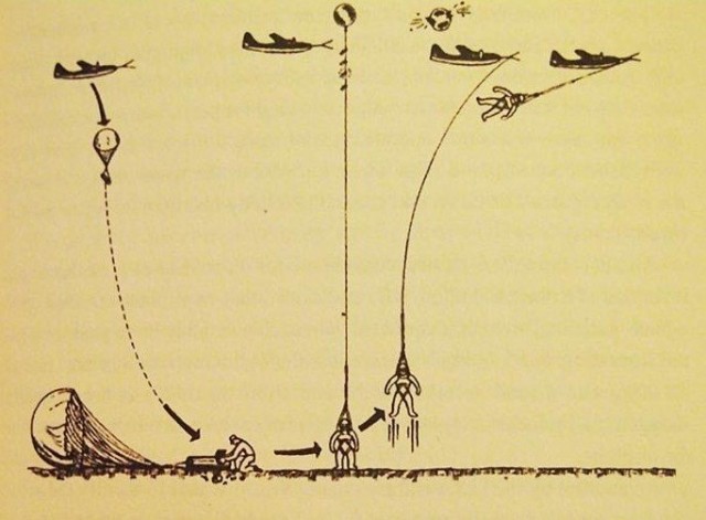 Тот самый B-17 Flying Fortress, задействованный в экспедиции на СП-8. На носу машины хорошо заметно устройство для захвата троса Второй элемент системы – тихоходный транспортный самолет (на базе «Летающей крепости», P-2 «Нептун», S-2 «Трэкер» или С-130 «Геркулес») с установленными на носу складывающимися «усами». Самолет заходит на цель на скорости 200-250 км/ч с таким расчетом, чтобы трос точно оказался в растворе «усов»: когда спасательный самолет «подсекает» трос, экипаж выбирает полезный груз с помощью лебедки. Пять минут кошмара – и ты на борту самолета. Остроумно и просто.