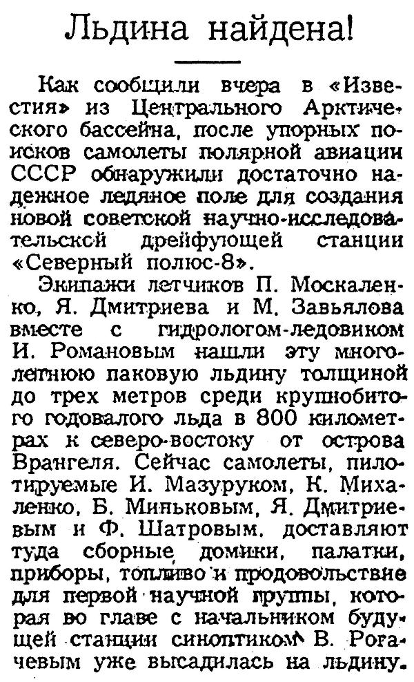 Как сообщили вчера в "Известия" из Центрального Арктического бассейна, после упорных поисков самолеты полярной авиации СССР обнаружили достаточно надежное ледяное поле для создания новой советской научно-исследовательской дрейфующей станции «Северный полюс-8».