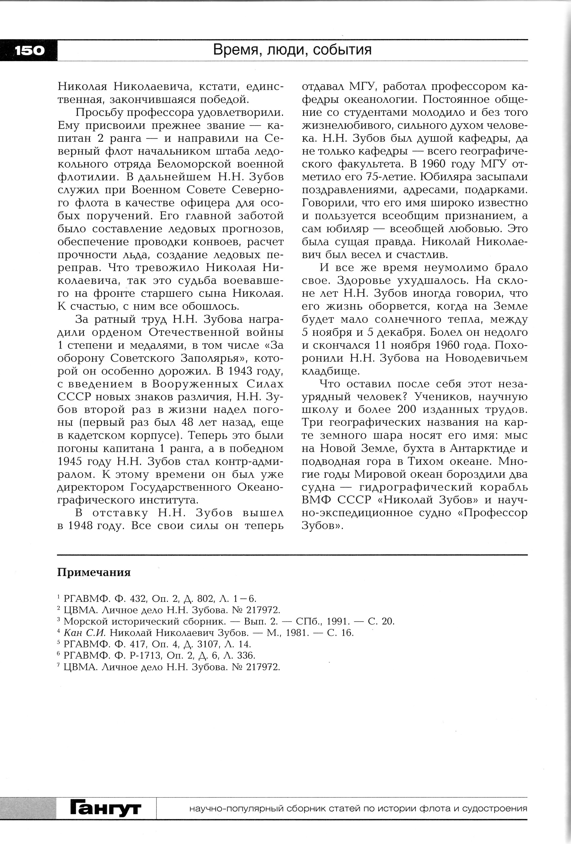 У древней стены на старой территории Новодевичьего кладбища стоит строгая плита из полированного лабрадорита - маленький бронзовый кораблик, распустив паруса, неизменно стремится вперед. Вечный покой и вечное движение. Размашистый автограф: "Н. Зубов", годы жизни: "1885-1960" и скупые строчки: "Профессор, доктор географических наук, инженер-контр-адмирал, заслуженный деятель науки и техники РСФСР"... И каждый год весенним майским днем вот уже более 20 лет у этого скромного надгробия собирается большая группа людей, в которой можно встретить капитана дальнего плавания и известного полярного летчика, пожилого профессора и совсем еще юных студентов. Но здесь все они только его ученики, и все они приходят сюда в его день рождения, чтобы снова и снова вспомнить Николая Николаевича Зубова - полярного исследователя, океанолога, географа.
