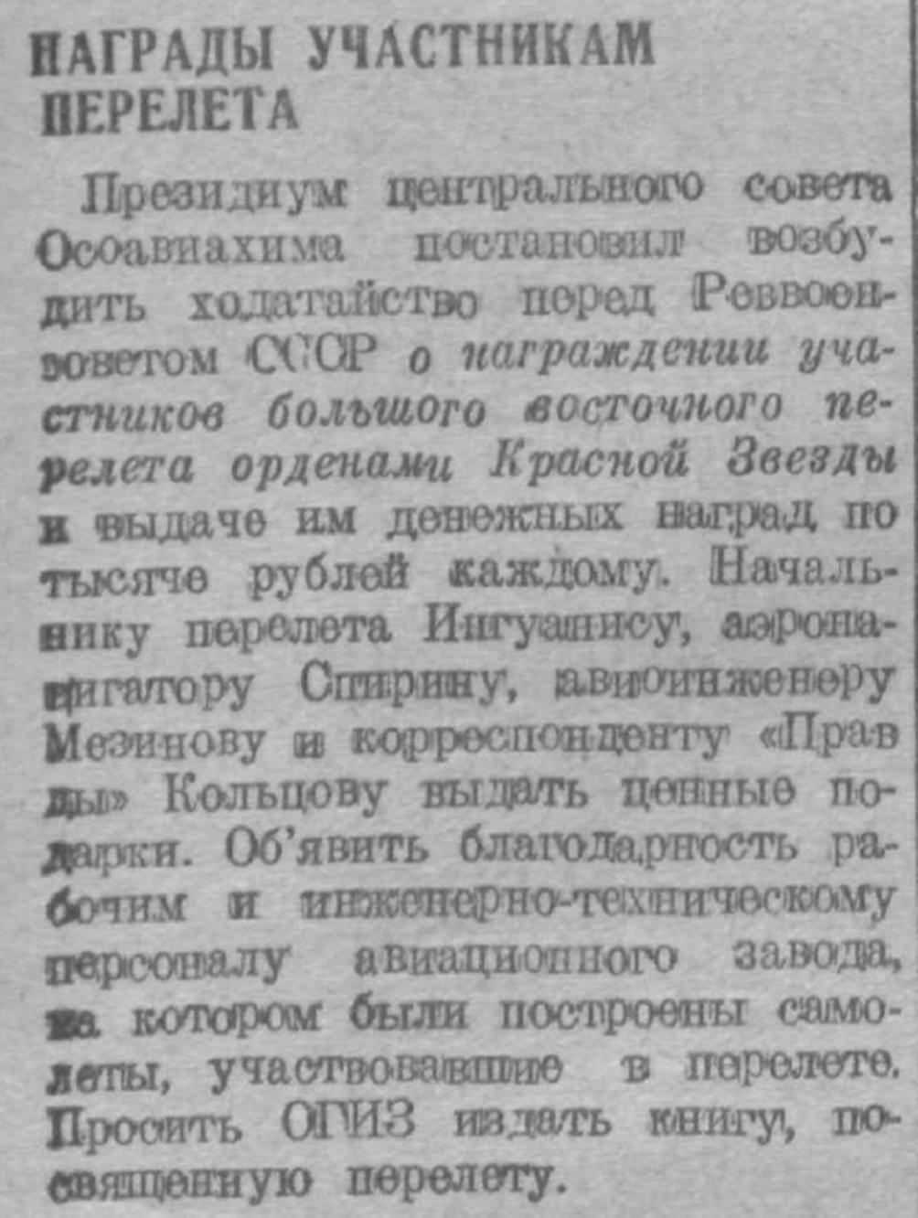 Президиум центрального совета Осоавиахима постановил возбудить ходатайство пород Реввоенсоветом СССР о награждении участников большого восточного перелета орденами Красной Звезды и выдаче им денежных наград по тысяче рублей каждому. Начальнику перелета Ингуанису, аэронавигатору Спирину, авиаинженеру Мезинову и корреспонденту «Правды» Кольцову выдать ценные подарки. Объявить благодарность рабочим и инженерно-техническому персоналу авиационного завода, на котором были построены самолёты, участвовавшие в перелете. Просить ОГИЗ издать книгу, посвященную перелету.