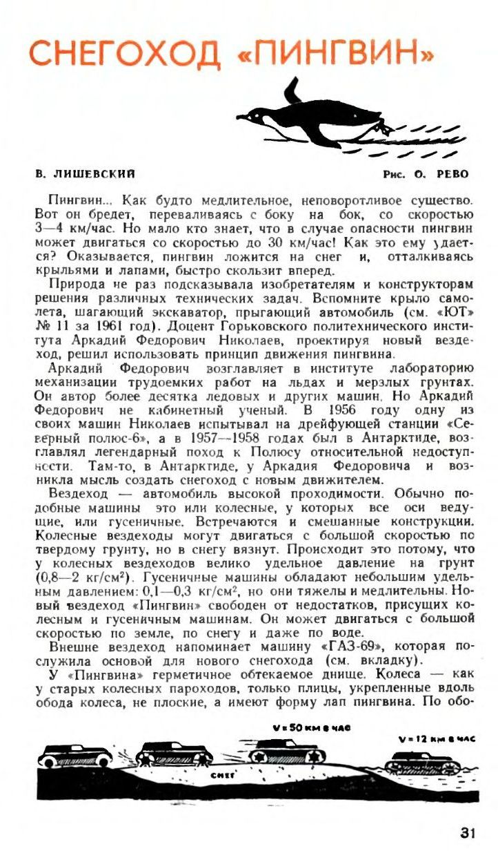Природа не раз подсказывала изобретателям и конструкторам решения различных технических задач. Вспомните крыло самолета, шагающий экскаватор, прыгающий автомобиль (см. «ЮТ» № 11 за 1961 год). Доцент Горьковского политехнического института Аркадий Федорович Николаев, проектируя новый вездеход, решил использовать принцип движения пингвина.