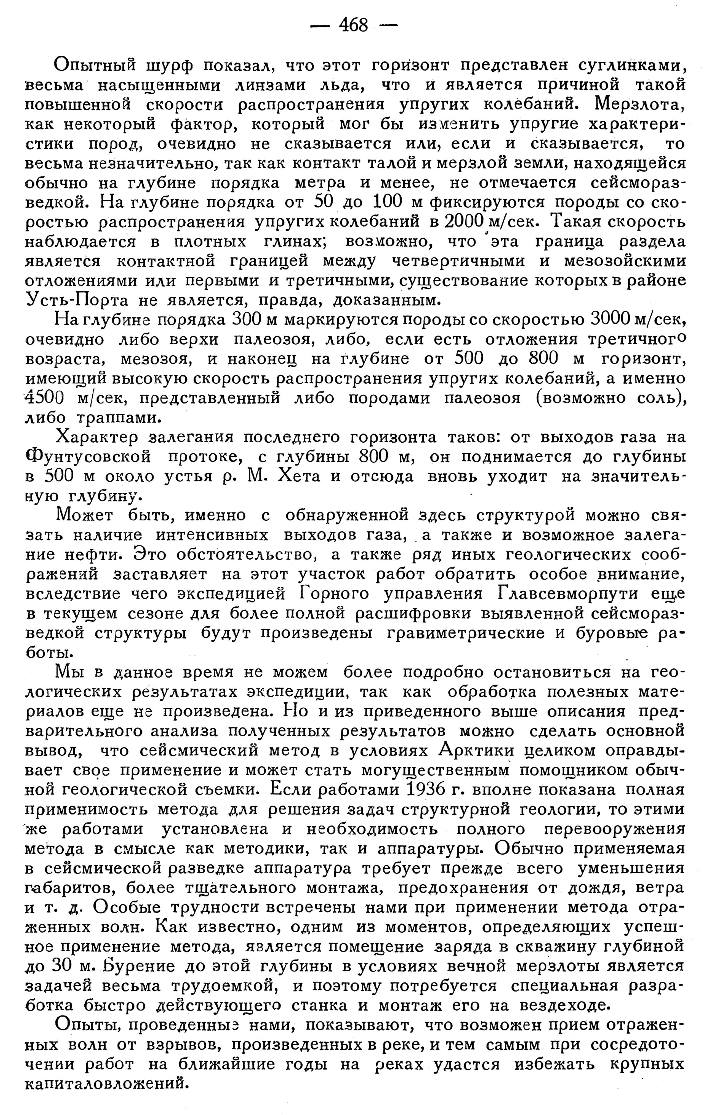 Таким образом работами 1936 г. доказана полная применимость сейсмического метода в условиях Арктики, и следует всячески форсировать широкий разворот сейсмических и других геофизических работ, комплексируя методы, так как только с помощью геофизики практически возможно в краткий срок решить основные вопросы геологического строения Советского Севера, правильно ориентировать буровые и геологоразведочные работы.