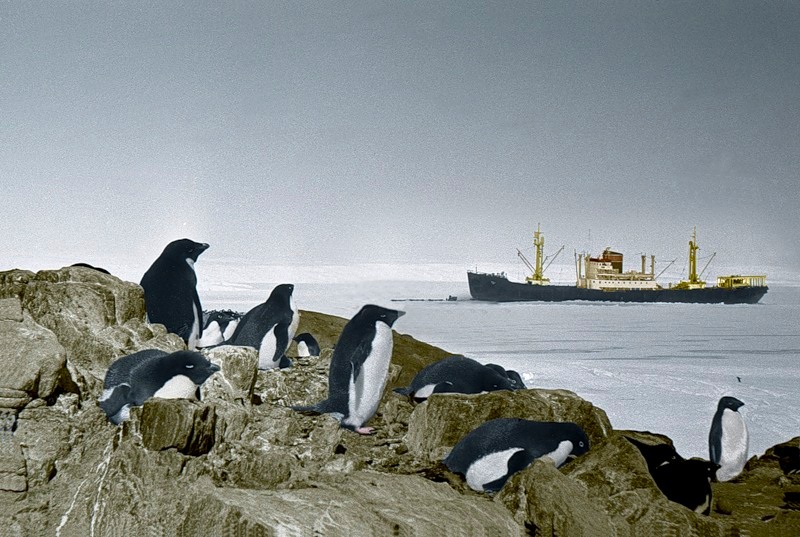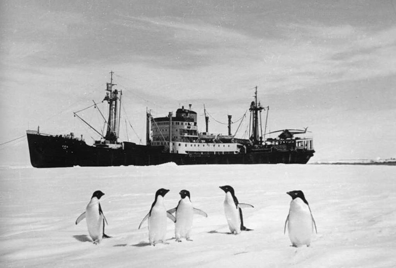 Description: The diesel-electric powered Russian icebreaking freighter Ob at Berth No.12, Port Adelaide early 1958, during the International Geophysical Year. She had been to the Antarctic and was returning home to Russia, taking the opportunity to load bagged grain and wool.