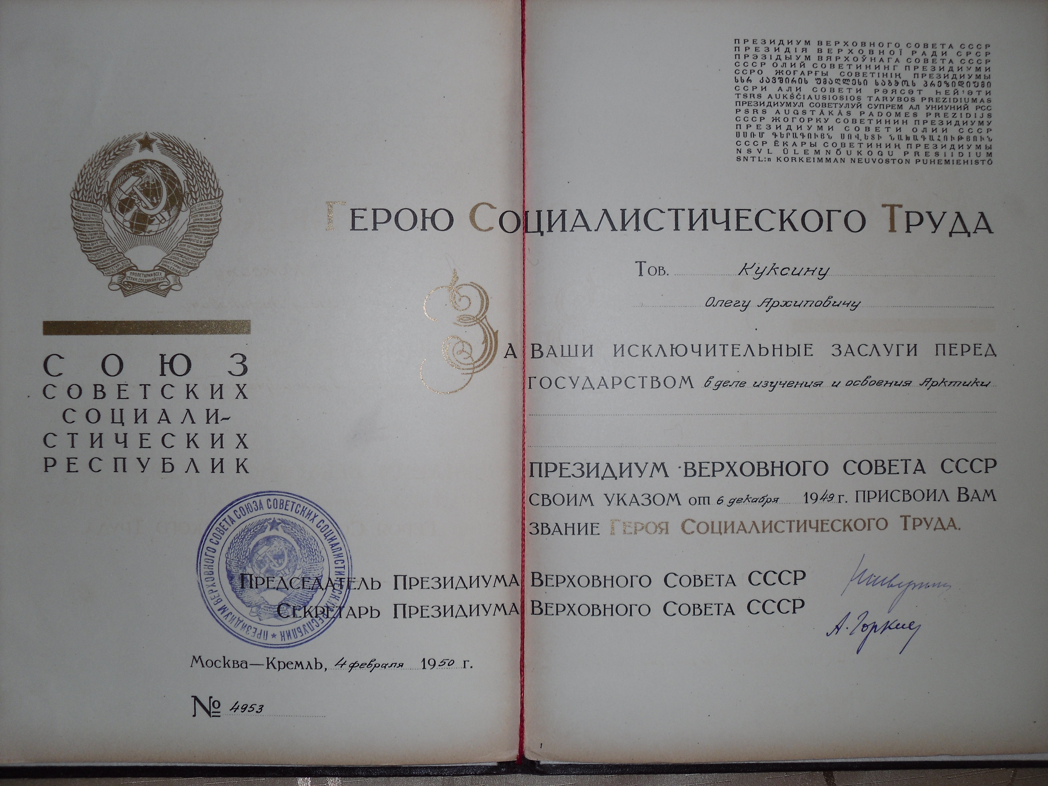 За Ваши исключительные заслуги перед государством в деле изучения и освоения Арктики, Президиум Верховного Совета СССР, своим указом от 6 декабря 1949 года присвоил Вам звание Героя Социалистического Труда.