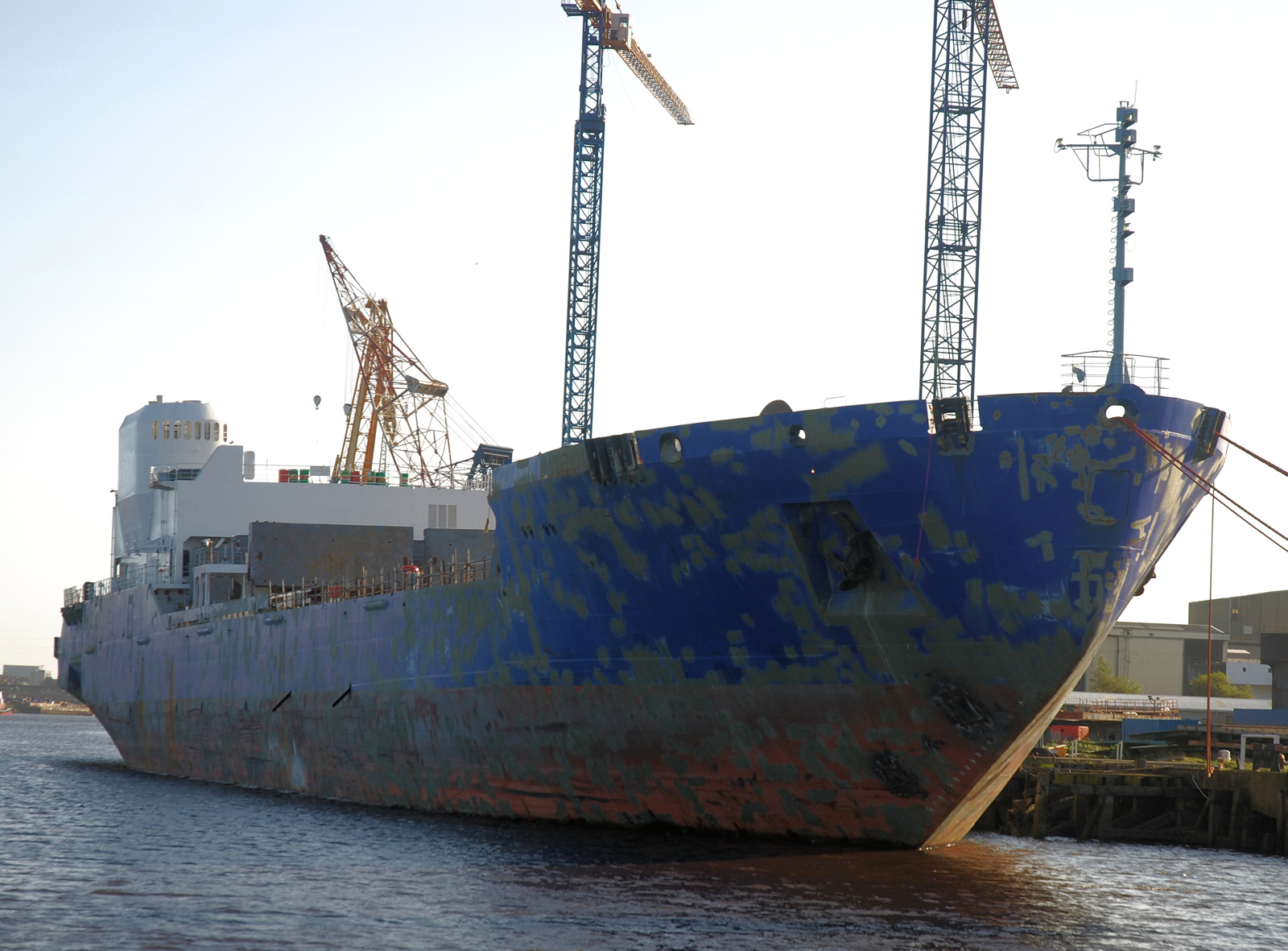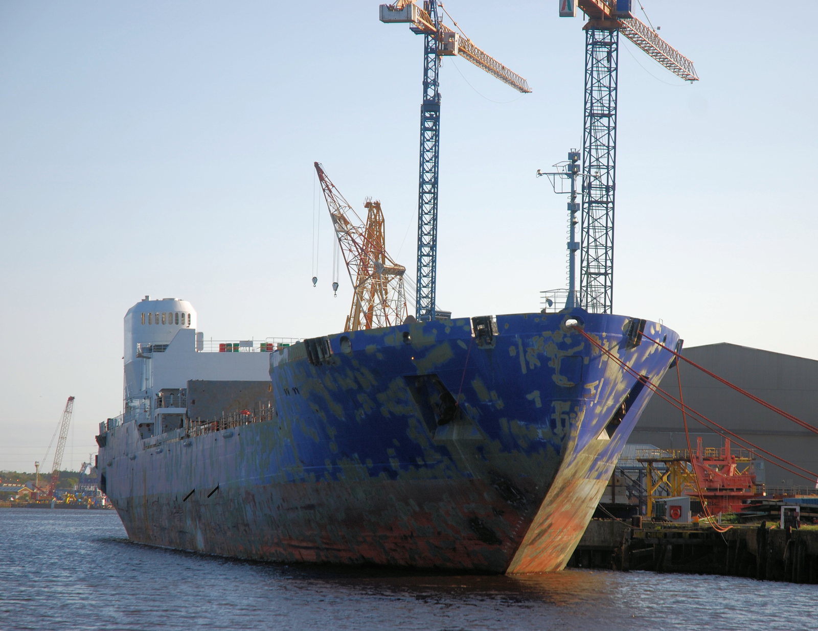 This, uhm…apparently derelict hull you see on the pics above is actually a high-tech vessel to be, somewhere in the future. No, it’s true….believe me please! This used to be the proud vessel Paardeberg, a Souh African icebreaker delivering goods & other stuff to the Antarctic but then she got bought by an Aberdeen company with big plans. They had her gutted in the U.S. of A and then transported on a heavy lift vessel to the Netherlands, towed to Aberdeen in the U.K. and then….that same company went bust.