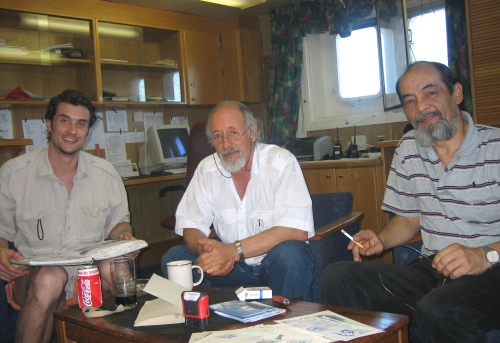 In the picture at left are from left to right, the Chief Engineer Denis Stojak, the Captain Gerard Scheltens and the ice-pilot Ruslan Zaynigabdinov.