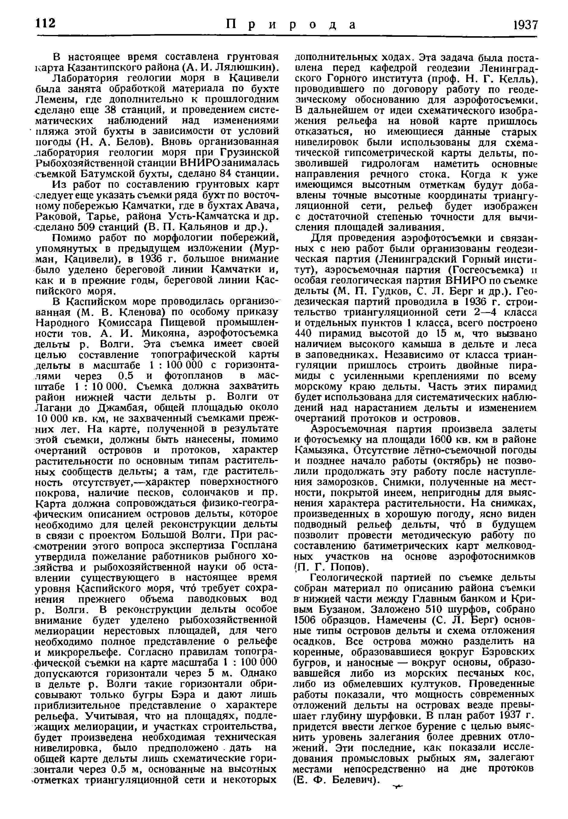 В Каспийском море проводилась организованная (М. В. Кленова) по особому приказу Народного Комиссара Пищевой промышленности тов. А. И. Микояна, аэрофотосъемка дельты р. Волги. Эта съемка имеет своей целью составление топографической карты дельты в масштабе 1 : 100 ООО с горизонталями через 0.5 и фотопланов в масштабе 1 : 10 ООО. Съемка должна захватить район нижней части дельты р. Волги от Лагани до Джамбая, общей площадью около 10 000 кв. км, не захваченный съемками прежних лет. На карте, полученной в результате этой съемки, должны быть нанесены, помимо очертаний островов и протоков, характер растительности по основным типам растительных сообществ дельты; а там, где растительность отсутствует, — характер поверхностного покрова, наличие песков, солончаков и пр.