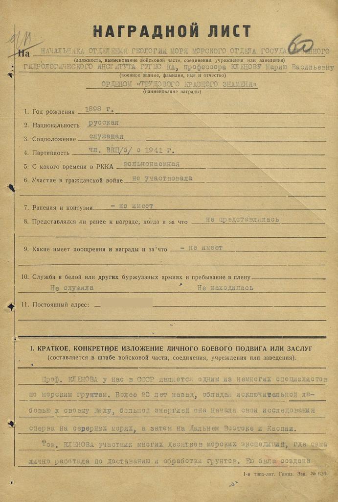 Кленова Мария Васильевна (1898-1976). Геолог, океанограф, доктор геолого-минералогических наук. Работала во Всесоюзном институте рыбного хозяйства и океанографии (1924-1941), в системе Главного управления гидрометслужбы Наркомата обороны СССР (1941-1944), в Государственном океанографическом институте (1944-1954), в Институте океанологии АН СССР (1955-1976); руководила отрядами ряда геологических экспедиций. Преподавала в Московском государственном университете.