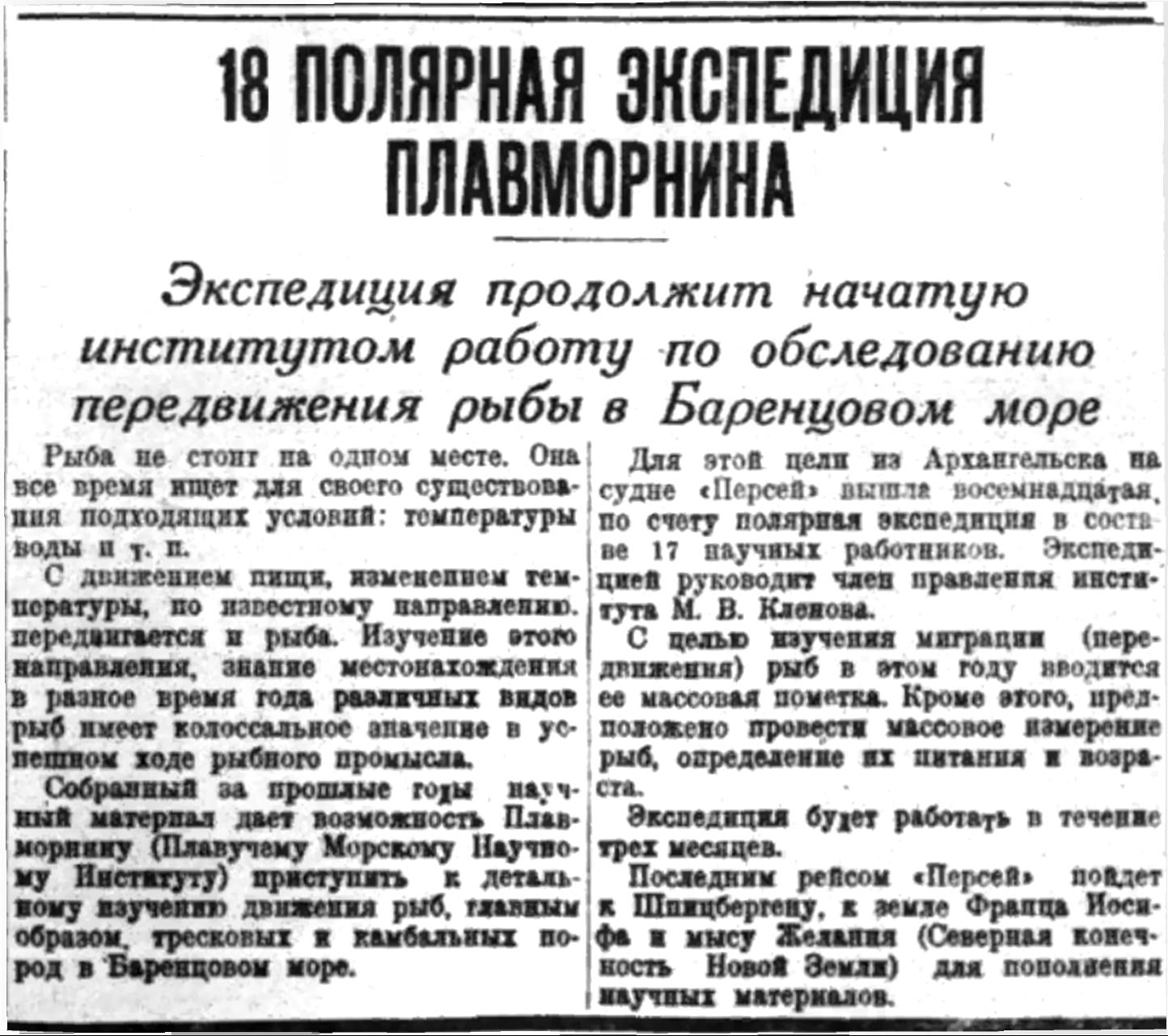Для этой цели из Архангельска на судне «Персей» вышла восемнадцатая, по счету полярная экспедиция в составе 17 научных работников. Экспедицией руководит член правления института М. В. Кленова.