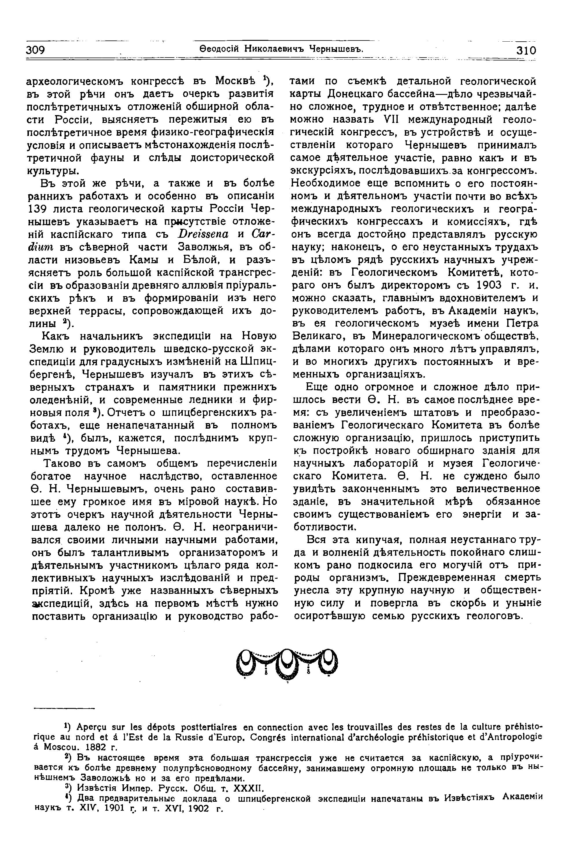 Чернышев Феодосий Николаевич (1856–1914)— выдающийся современный русский геолог и палеонтолог, особенно известный своими исследованиями тектоники и палеозойских образований Урала и севера России. Род. в Киеве в 1856 г. Учился в киевской гимназии, морском училище и горном институте; по окончании курса в 1880 г. производил геологические исследования в Среднем Урале. В 1882 г. избран геологом геологического комитета, а с 1903 г. состоит директором этого учреждения. В 80-х гг. работал ежегодно в Южном Урале. В 1889—90 гг. начальствовал ученой экспедицией, снаряженной горным ведомством для изучения Тиманского кряжа. С 1892 г., в течение нескольких лет, руководил работами по геологической съемке Донецкого бассейна; в 1895 г. стоял во главе экспедиции на Новую Землю. В 1899—1902 гг. был начальником экспедиции по производству градусных измерений на Шпицбергене. В 1903 г. занимался изучением Андижанского землетрясения в Ферганской области. Ч. состоит членом академии наук и председателем отделения физической географии Императорского русского географического общества. По настоящее время им напечатано, по преимуществу в изданиях геологического комитета и Императорского с.-петербургского минералогического общества, свыше 60 ученых работ, в том числе несколько объемистых монографий по фауне палеозойских образований Урала и Тимана, а также и других местностей России. За свои труды Ч. получил ряд премий и медалей от минералогического общества, академии наук и высшую Константиновскую медаль Императорского русского географического общества. Главнейшие из ученых трудов Ч.: "Материалы по изучению девонских отложений России" (1884); "Фауна нижнего девона западного склона Урала" (1885); "Фауна соседнего и верхнего девона западного склона Урала" (1887); "Общая геологическая карта России. Л. 139"; "Описание центральной части Южного Урала" (1889); "Aperçu sur les depôts posttertiaires au Nord et à l'Est de la Russie d'Europe" (1891); "Фауна нижнего девона восточного склона Урала" (1893); "Орографический очерк 139 листа геологической карты России" (совместно с А. Карпинским, 1897); "Верхнекаменноугольные брахиоподы Урала и Тимана" (1902).