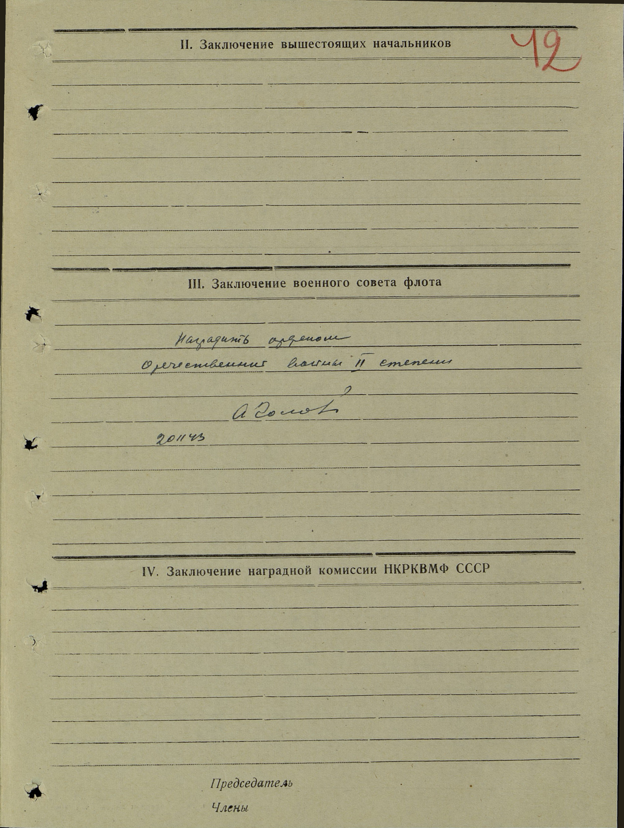 За время пребывания за границей отлично изучил свою технику и показывал образцы [поведения] в службе, учебе и учение. При выполнении задания СФ по проводке ледокола «И. Сталин» и [при] потоплении при этом двух подводных лодок противника тов. Антипин помогал минерам по по…нию израсходование мин.