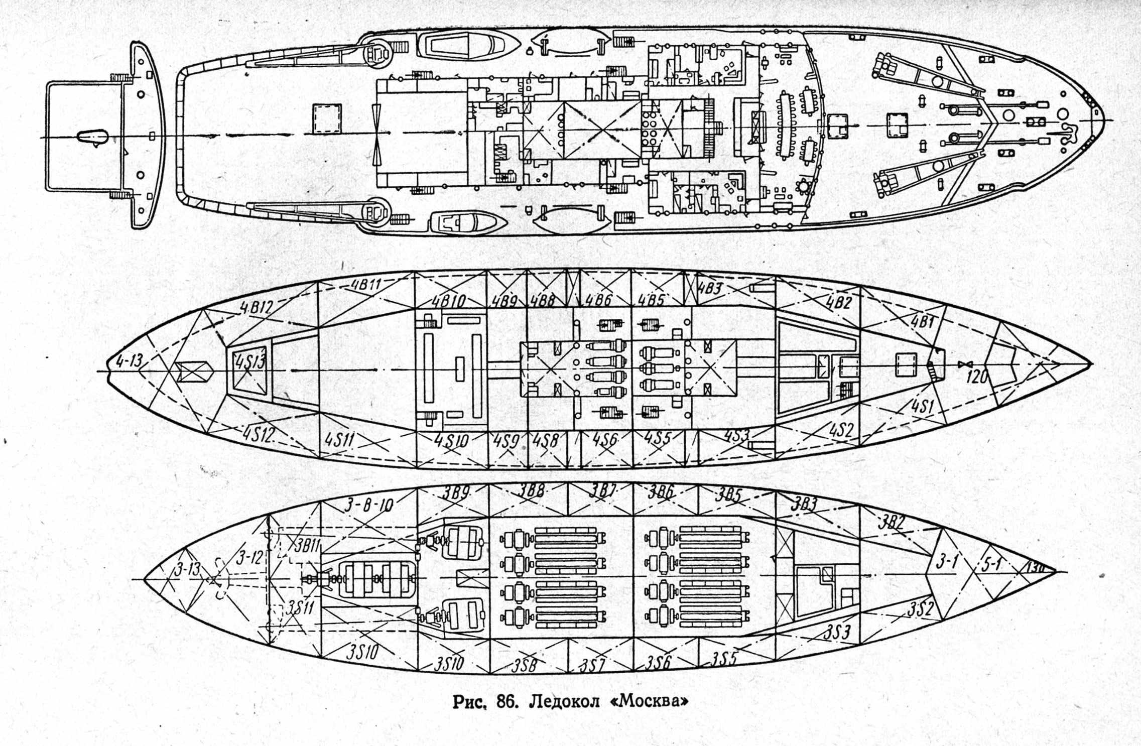 Судно разделено поперечными переборками на 9 водонепроницаемых отсеков. Все внутренние помещения (до средней палубы) отделены от наружного борта продольными переборками. Второе дно простирается на всю длину. Максимальный.запас бункера позволяет пройти на экономичном режиме без пополнения топлива свыше 35000 миль, Сварной корпус ледокола выполнен из особо прочной стали. Толщина листа ледового пояса в носовой части достигает 50 миллиметров. Корпус рассчитан на большие напряжения и выдерживает давление на квадратный метр в носовой части — 1000, в средней части — 600, в кормовой — 800 тонн. Для сравнения напомним, что корпус обычных транспортных судов способен выдержать давление порядка 30 — 15 тонн на 1 кв. м.
