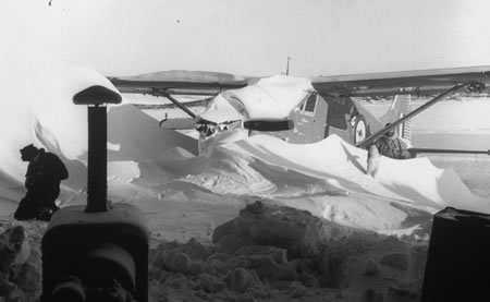 Проснувшись утром, осмотрелись. Солнечный день, замечательная видимость. Всем нам важно знать, где находимся? Наша удачная посадка - на лед большого озера. Нa этом льду есть небольшой снег, так как были уже дни оттепели, а наш самолет прокатился до берега, где больше снега, и остановился. А берег озера низкий и во все стороны равнина, кочковатая тундра и никакого признака жизни, кроме куропаток - они белые и трудно различимы от снега.