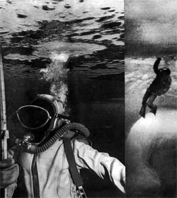 Под водой мало света. Сентябрь, погода пасмурная, солнца нет. Однако фосфоресцирующий циферблат глубиномера видно хорошо. Выхожу из лунки под лед, там осматриваюсь, проверяю снаряжение — не дай бог малейшая дырка в костюме! Нет, все в порядке. Лед имеет осадку 3 метра, опускаюсь ниже — никакого грунта подо мной нет.