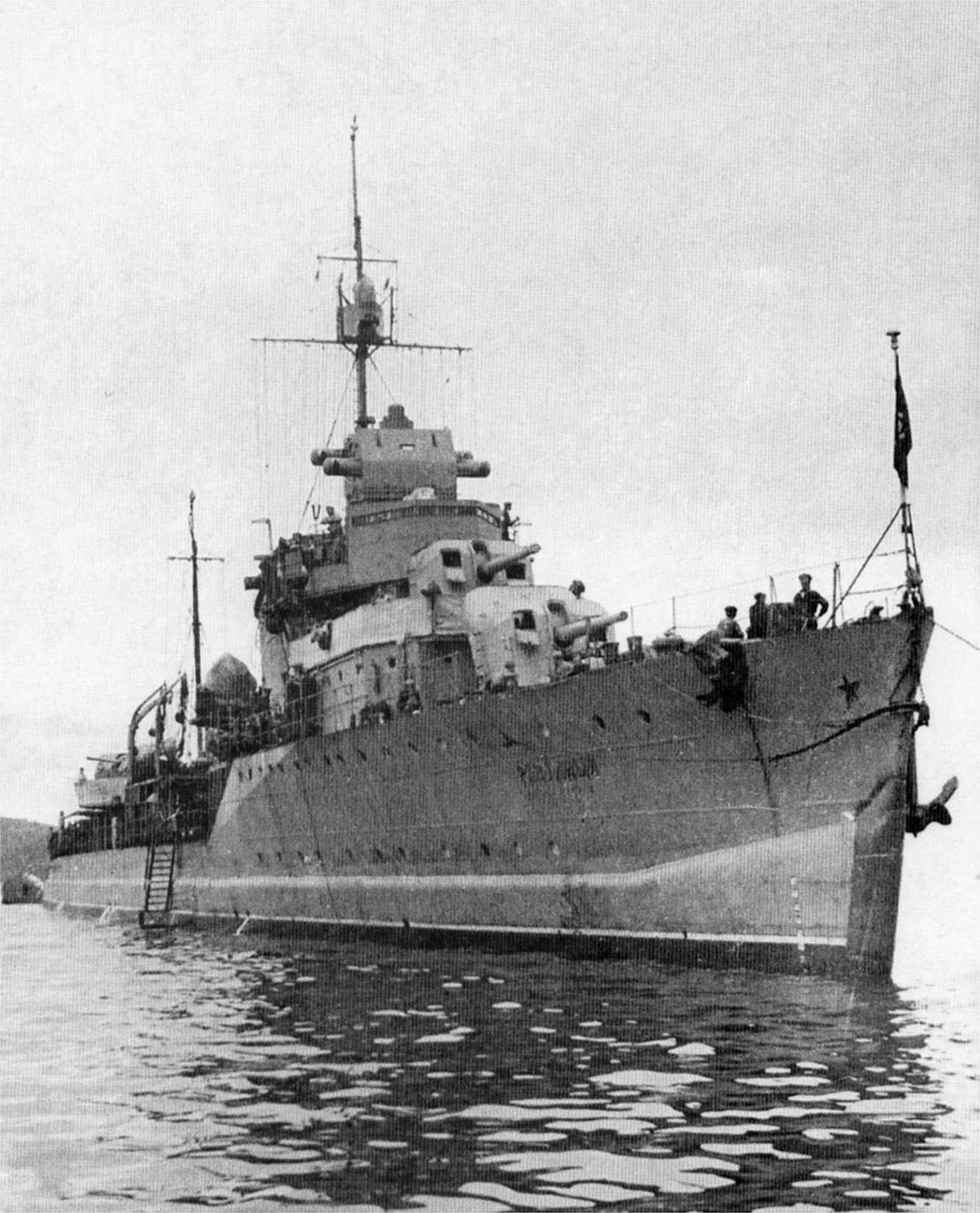 Эсминец проекта 7 «Разумный» после перехода Северным морским путем в составе Экспедиции особого назначения ЭОН-18 с Тихоокеанского на Северный флот. На фотографии видна «ледовая шуба» — специальный пояс в районе ватерлини из деревянных брусьев, обитый кровельным железом.