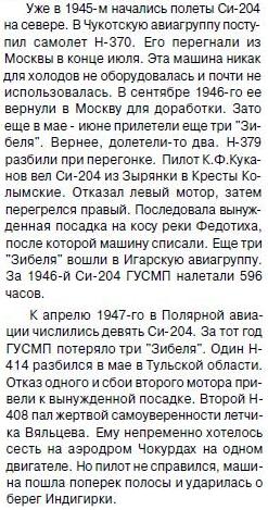 :": Уже в 1945-м начались попеты Си-204 на севере. В Чукотскую авиагруппу поступил самолет Н-370. Его перегнали из Москвы в конце июля. Эта машина никак для холодов не оборудовалась и почти не использовалась. В сентябре 1946-го ее вернули в Москву для доработки. Зато еще в мае - июне прилетели еще три "Зи-беля". Вернее, долетели-то два. Н-379 разбили при перегонке. Пилот К.Ф.Куканов вел Си-204 из Зырянки в Кресты Колымские. Отказал левый мотор, затем перегрелся правый. Последовала вынужденная посадка на косу реки Федотиха, после которой машину списали. Еще три "Зибеля" вошли в Игарскую авиагруппу. За 1946-й Си-204 ГУСМП налетали 596 часов.