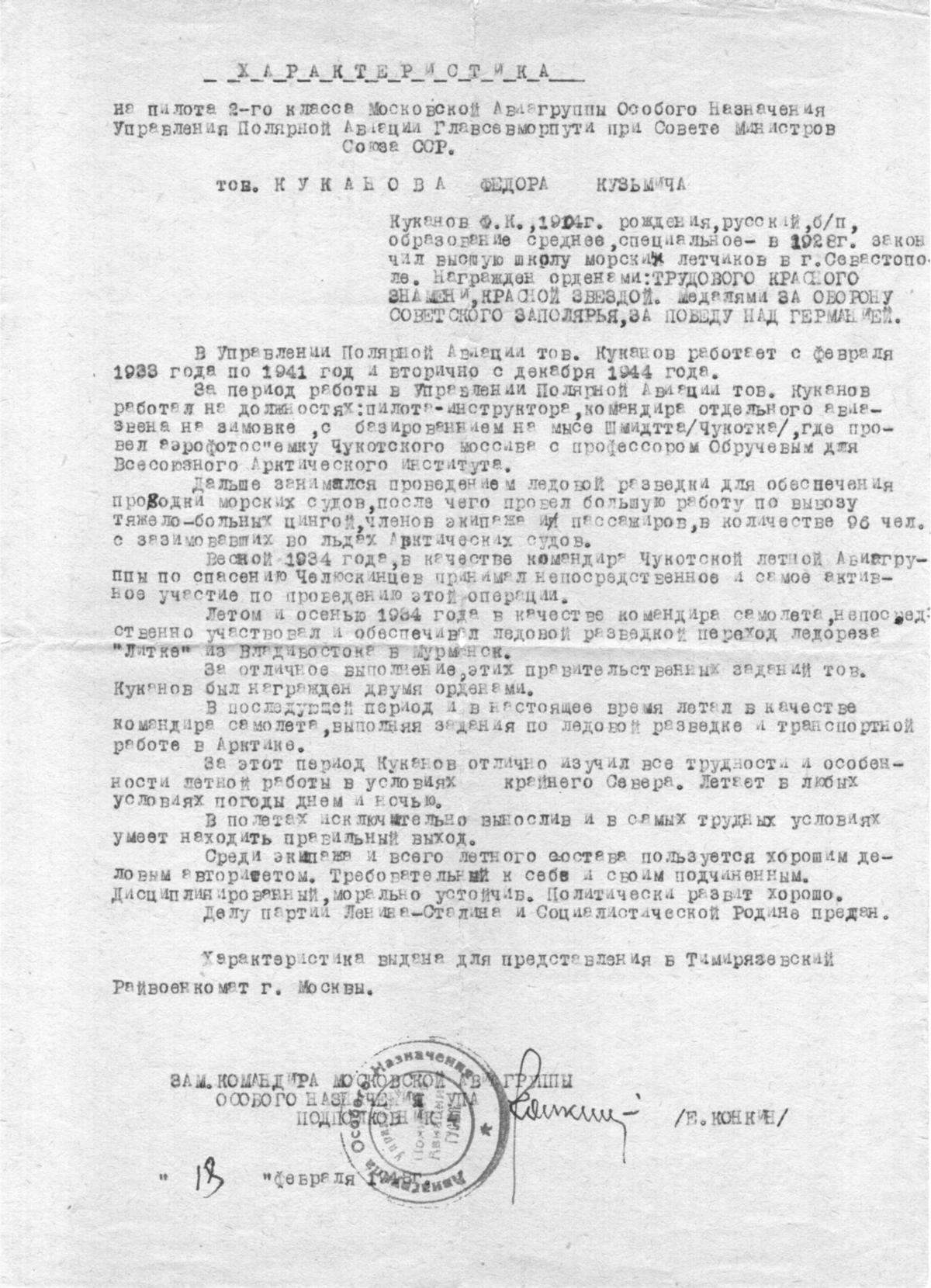 В Управлении Полярной Авиации тов. Куканов работает с февраля 1933 года по 1941 год и вторично с декабря 1944 года.