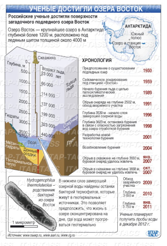 «Российские ученые после более 30 лет бурения проникли в подледниковое озеро Восток в Антарктиде, сообщил в понедельник РИА Новости источник в научных кругах. "Вчера на станции Восток в Антарктиде наши ученые на глубине 3,768 тысячи метров завершили бурение и достигли поверхности подледникового озера", - сказал собеседник агентства. Источник в структурах Росгидромета подтвердил, что ученые достигли поверхности озера, не сообщив подробности.»