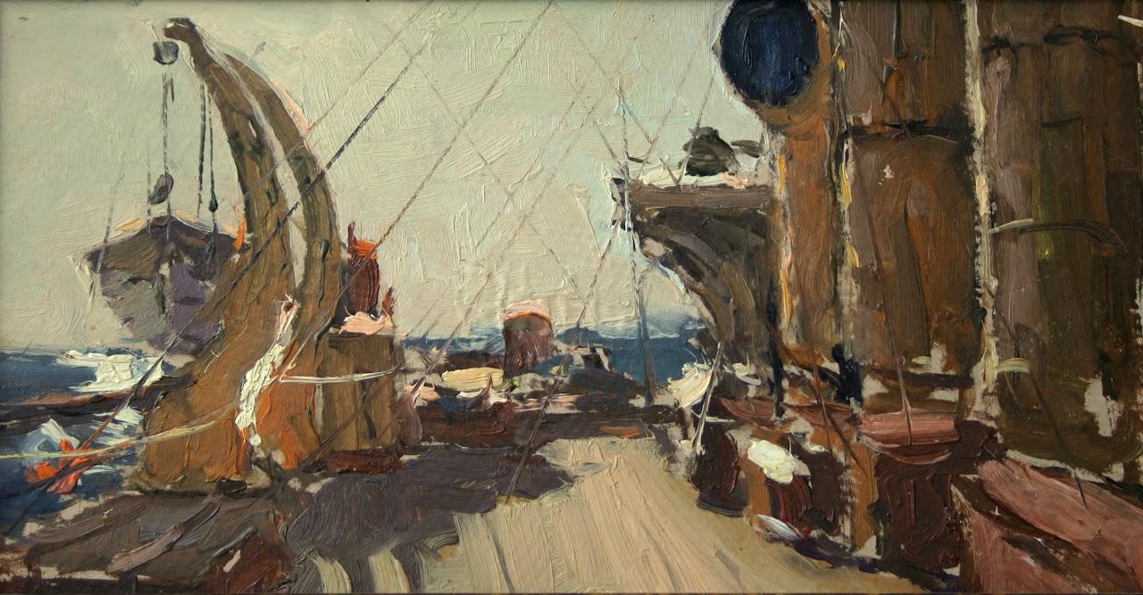 Вячеслав Кубарев "Шлюпки на ледоколе." 19х33 картон, масло 1959 г.