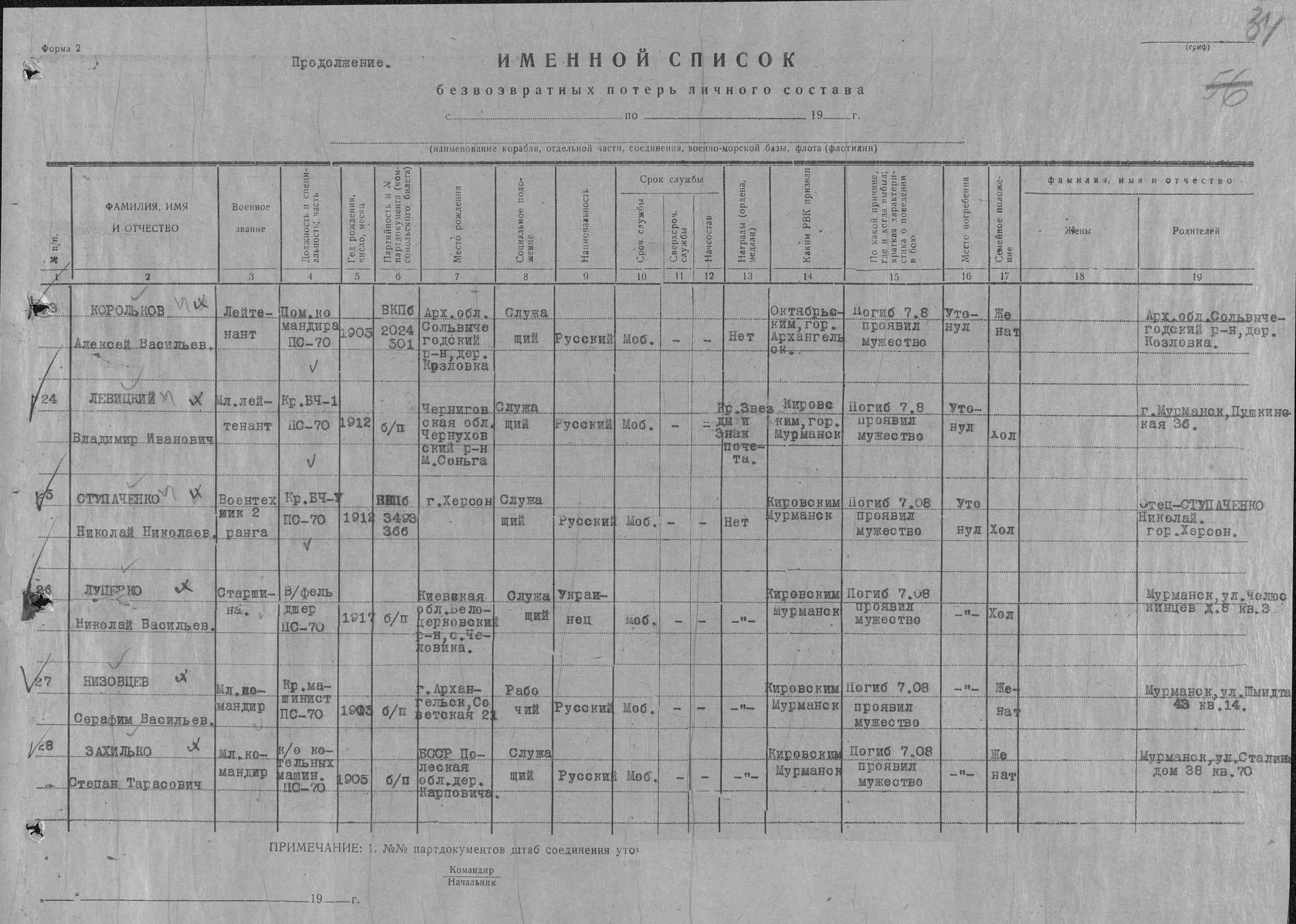 погибших 6 августа 1941 г. при торпедировании германской ПЛ U-652 в р-не Териберки.