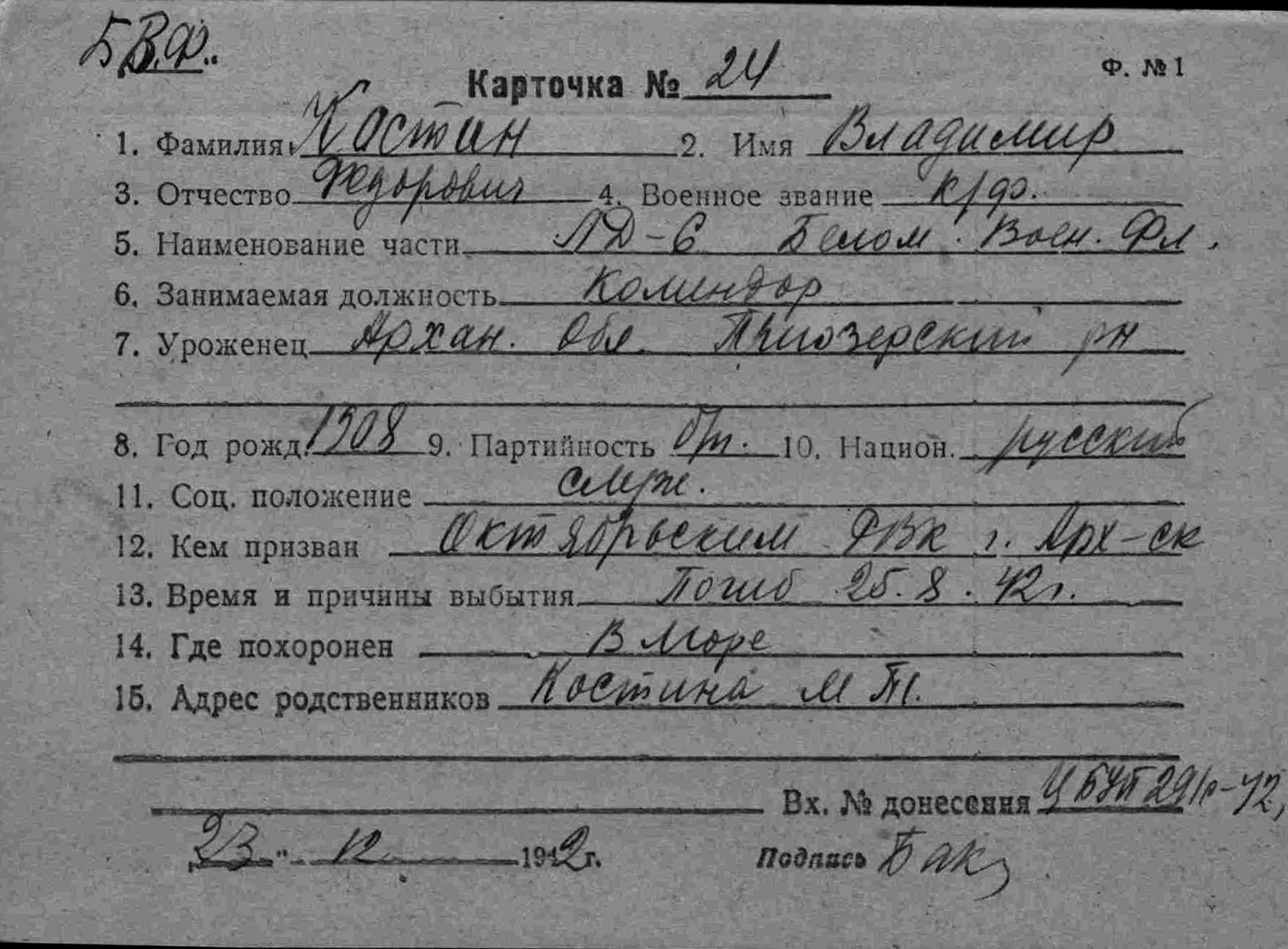 Дата и место призыва __.__.1941 Октябрьский РВК, Архангельская обл., г. Архангельск, Октябрьский р-н