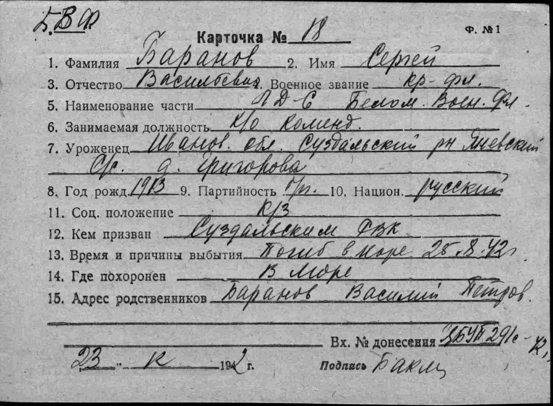Дата и место призыва __.__.1941 Суздальский РВК, Ивановская обл., Суздальский р-н