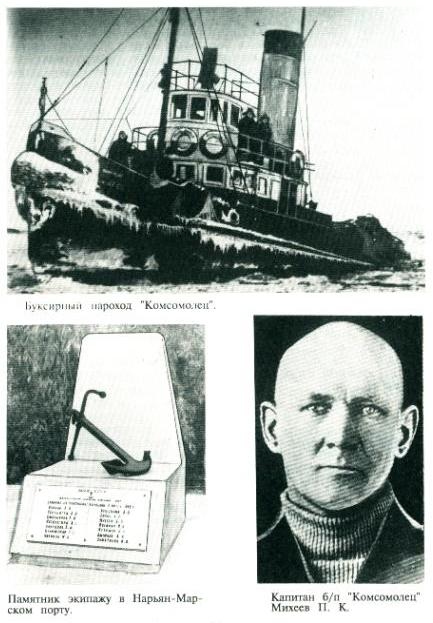 Это был трудяга-буксир, который занимался портовыми работами, а также буксировкой барж из района Фарихи в порт. Во время ВОВ «Комсомолец» был передан в аренду строительства № 300 НКВД. Я не буду описывать последний рейс судна. Небольшой рассказ об этом есть в книге «Нарьян-Марский морской порт - 70 лет». Авторы А.М. и М.А. Спирихины. Есть информация и в Энциклопедическом словаре НАО. Небольшая справка:
