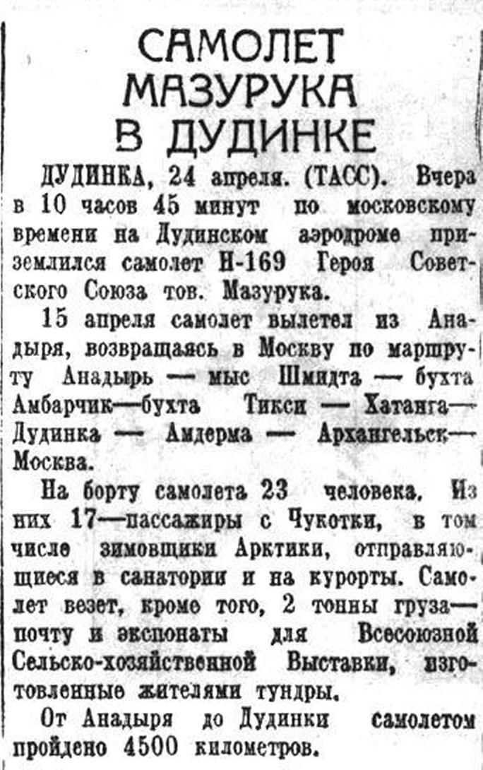 ДУДИНКА, 24 апреля. (ТАСС). Вчера в 10 часов 45 минут по московскому времени на Дудинском аэродроме приземлился самолет Н-169 Героя Советского Союза тов. Мазурука.