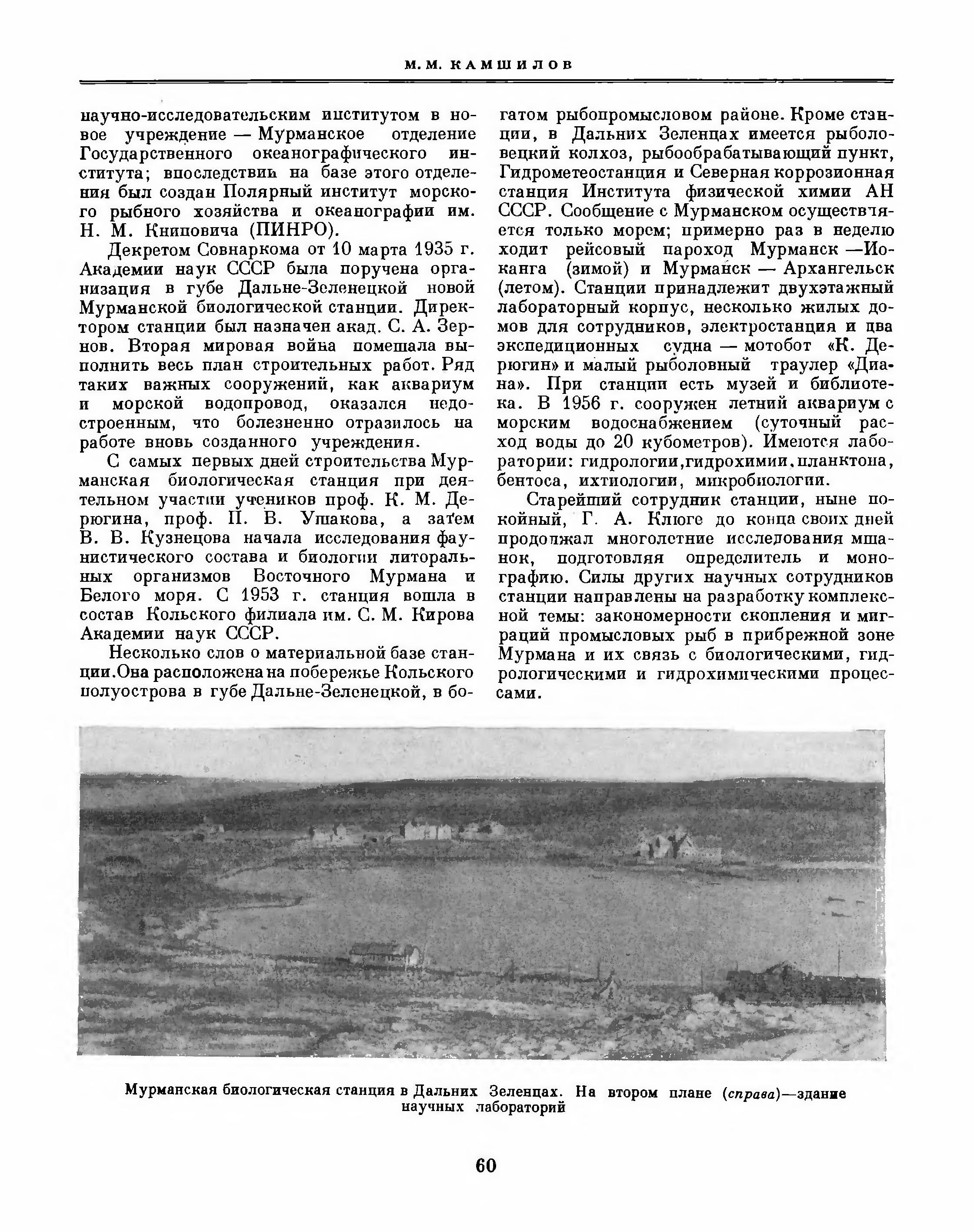 Несколько слов о материальной базе станции. Она расположена на побережье Кольского полуострова в губе Дальне-Зеленецкой, в богатом рыбопромысловом районе. Кроме станции, в Дальних Зеленцах имеется рыболовецкий колхоз, рыбообрабатывающий пункт, Гидрометеостанция и Северная коррозионная станция Института физической химии АН СССР. Сообщение с Мурманском осуществляется только морем; примерно раз в неделю ходит рейсовый пароход Мурманск — Иоканга (зимой) и Мурманск — Архангельск (летом). Станции принадлежит двухэтажный лабораторный корпус, несколько жилых домов для сотрудников, электростанция и два экспедиционных судна — мотобот «К. Дерюгин» и малый рыболовный траулер «Диана». При станции есть музей и библиотека. В 1956 г. сооружен летний аквариуме морским водоснабжением (суточный расход воды до 20 кубометров). Имеются лаборатории: гидрологии, гидрохимии, планктона, бентоса, ихтиологии, микробиологии.
