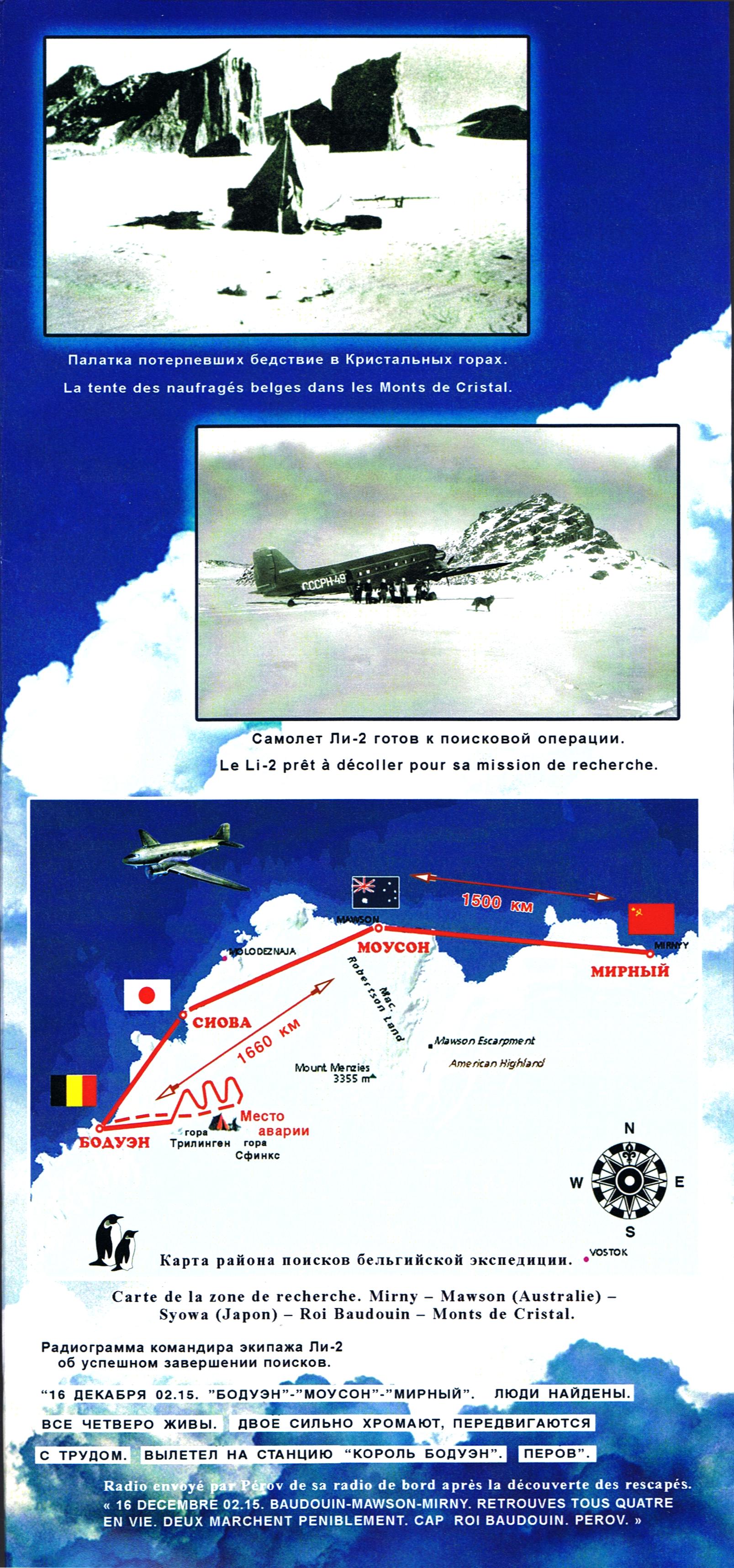 Во время Третьей КАЭ была проведена операция по спасению бельгийских полярников, самолет которых потерпел аварию в районе Кристалльных гор (72° ю.ш., 29° в.д.), в 250 км от бельгийской станции Король Бодуэн. На поиски бельгийских полярников вылетел самолет ЛИ2, пилотируемый В.М.Перовым. 15 декабря с самолета были обнаружены четыре члена бельгийской экспедиции во главе с капитаном Гастоном де Жерлашем. Они были взяты на борт самолета и доставлены к месту стоянки вертолета, который впоследствии доставил их на станцию. За время спасательной операции самолет ЛИ2 пролетел более 11 тыс. км, произвел пять посадок в глубине континента, в неисследованной местности со сложным рельефом.